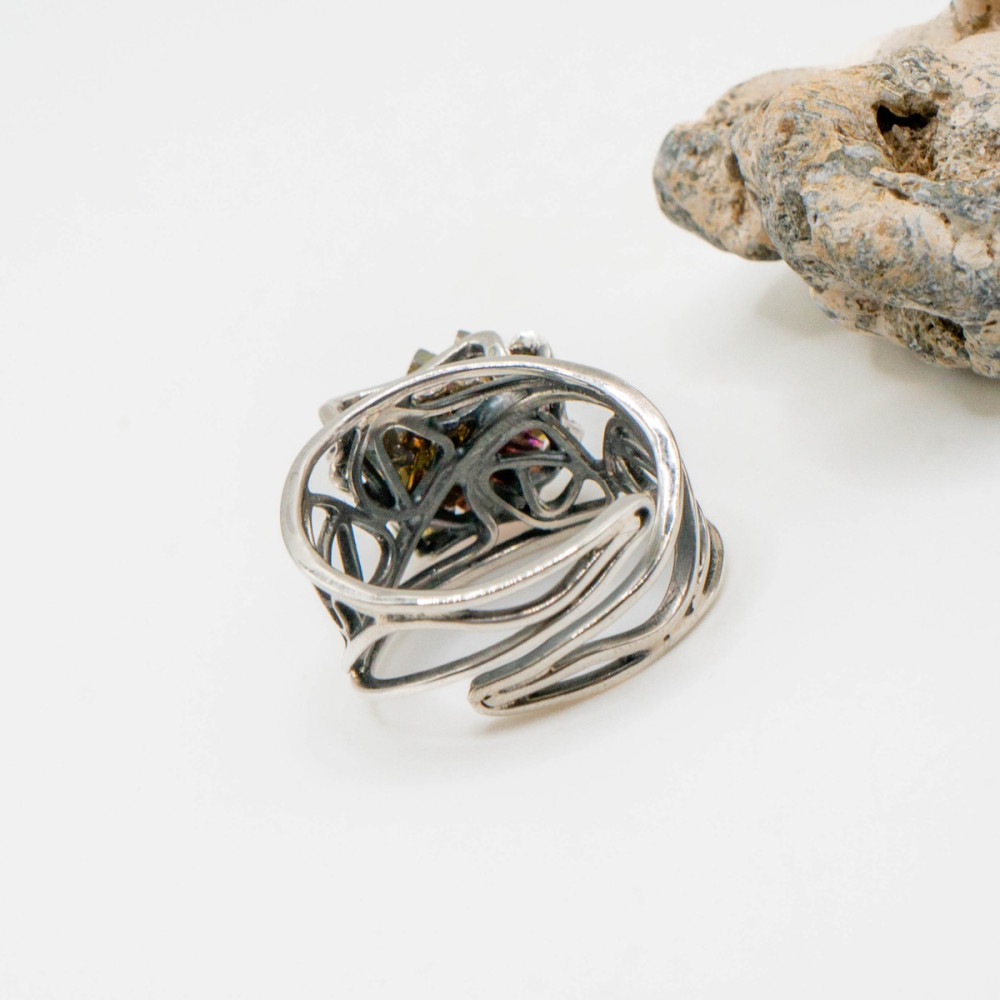 Срібна оправа підкреслює футуристичний характер каменю та дбайливо зберігає його первозданну красу. Ця каблучка — для тих, хто обирає авторські прикраси з характером і цінує індивідуальність.