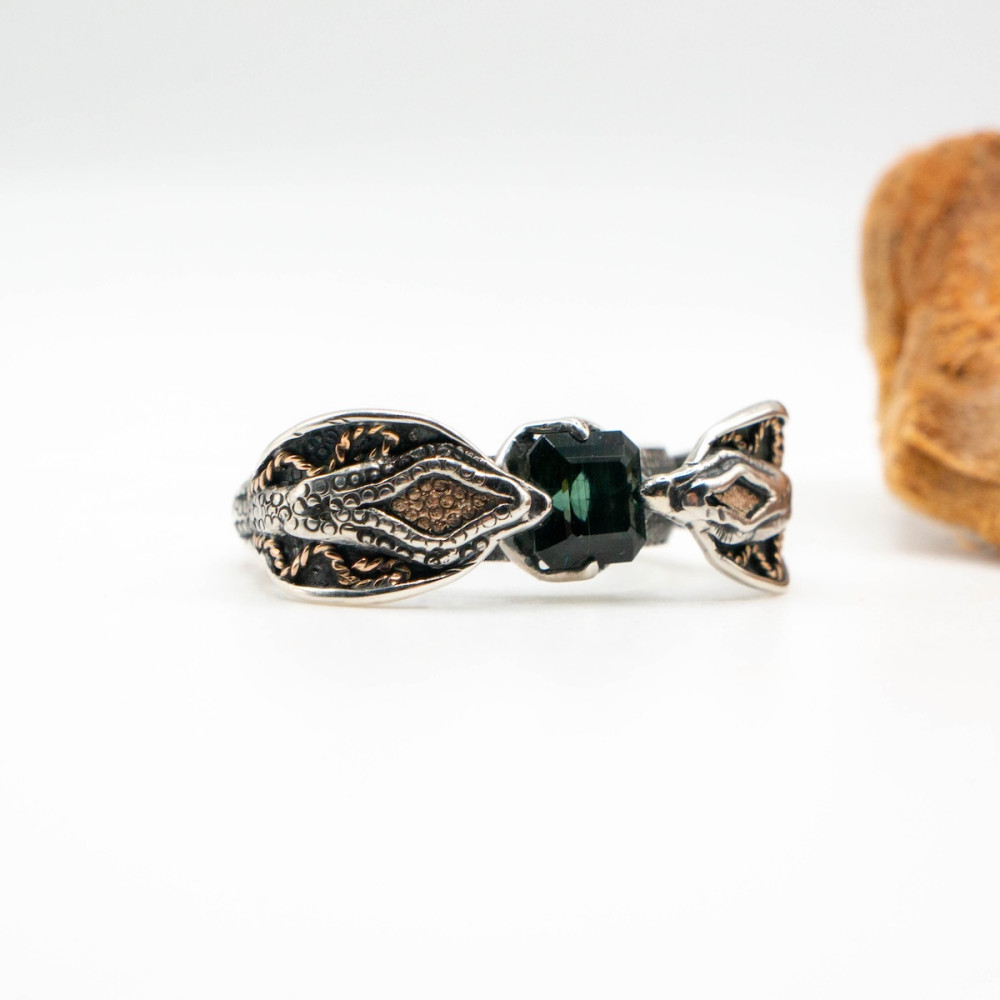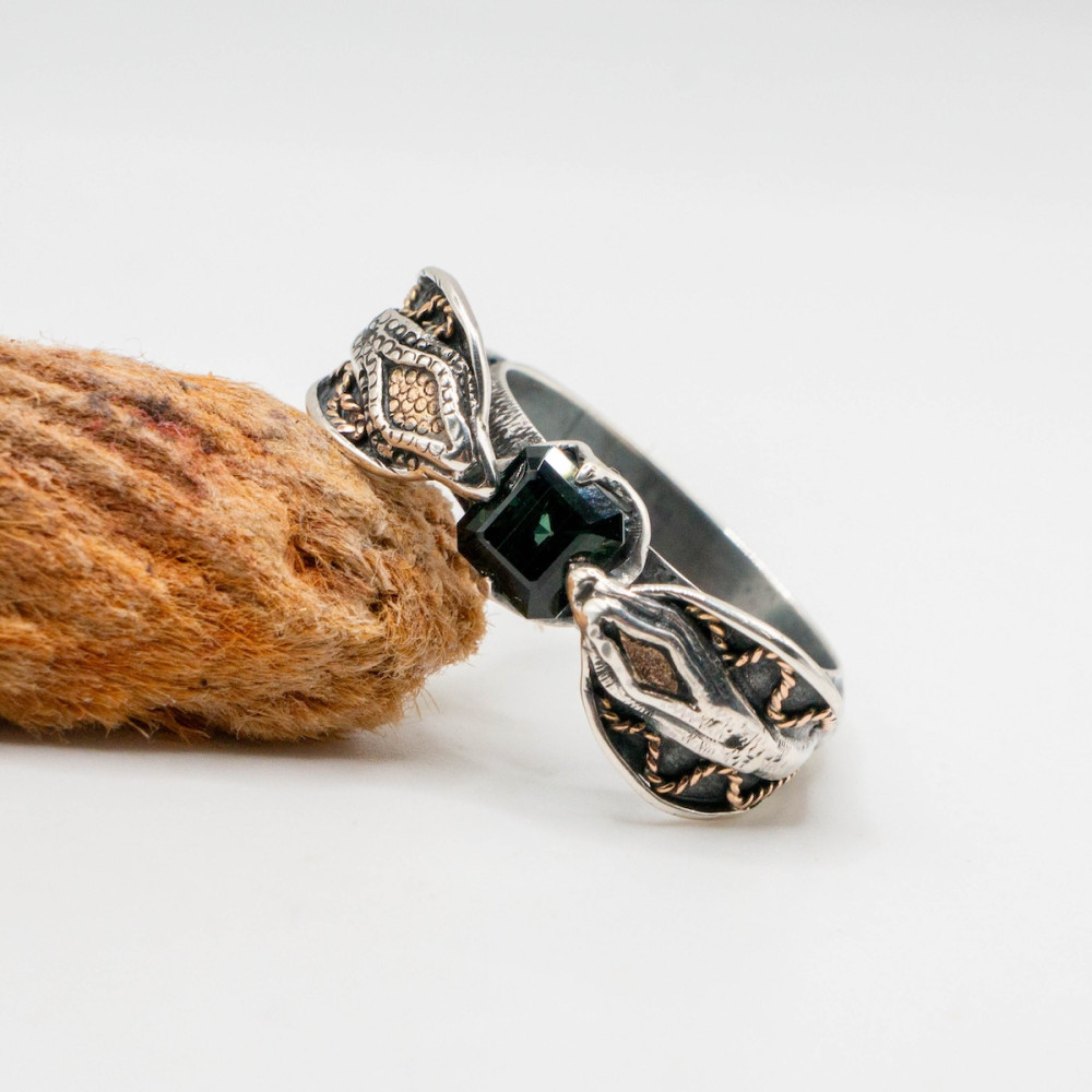 Ніжна та витончена прикраса зі срібла, виконана у вигляді милого бантика. У центрі сяє натуральний турмалін – камінь гармонії, енергії та натхнення. Це кільце поєднує легкість форми та силу природного каменю, підкреслюючи романтичність і витончений смак своєї власниці.