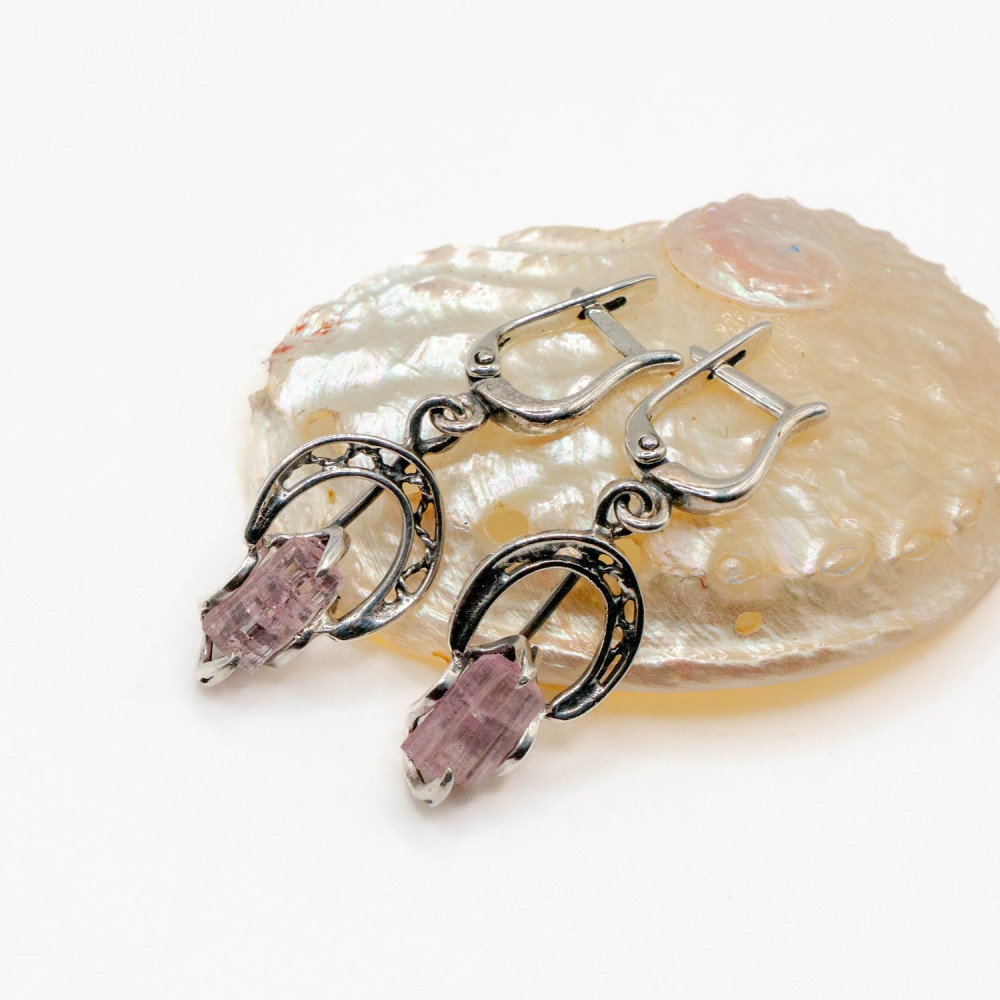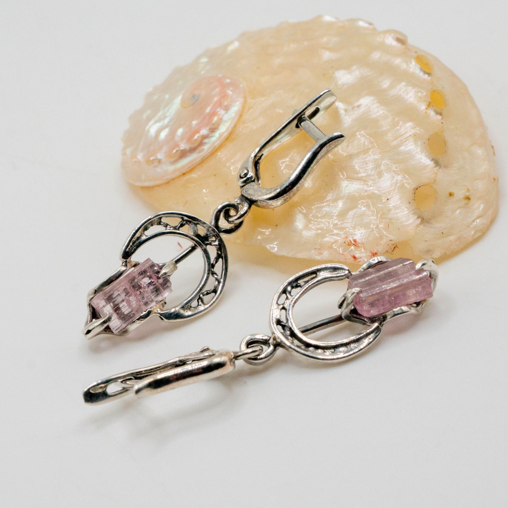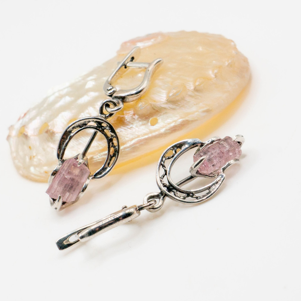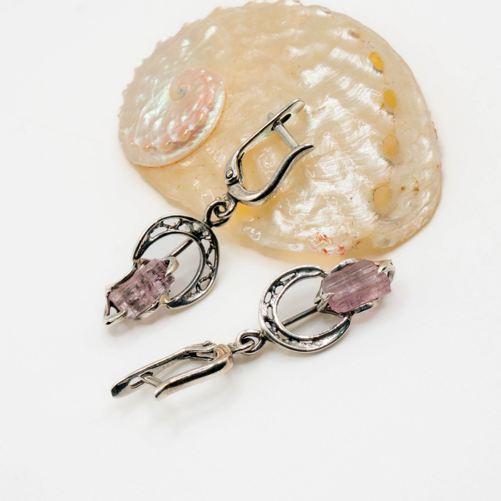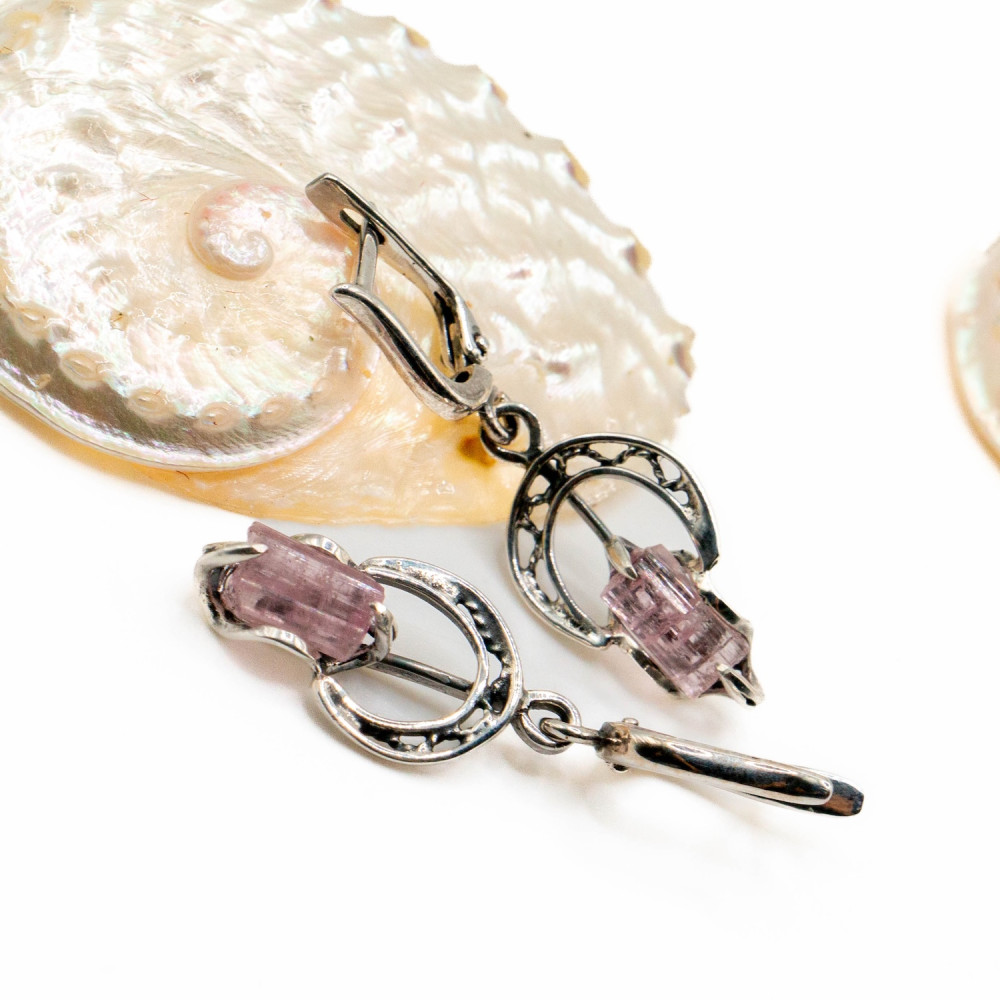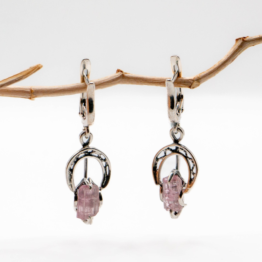 Ці сережки створені для руху. Вони м’яко коливаються, вловлюючи світло й підкреслюючи природну прозорість рожевого турмаліну. Камінь збережений у своїй кристалічній формі — з живою текстурою, тонкими лініями росту та ніжним внутрішнім сяйвом. Срібні кола в дизайні символізують завершеність і баланс, а органічна оправа не обмежує мінерал, дозволяючи йому звучати вільно та природно.