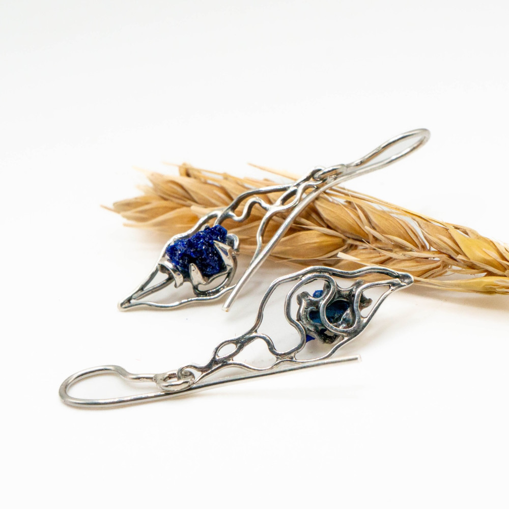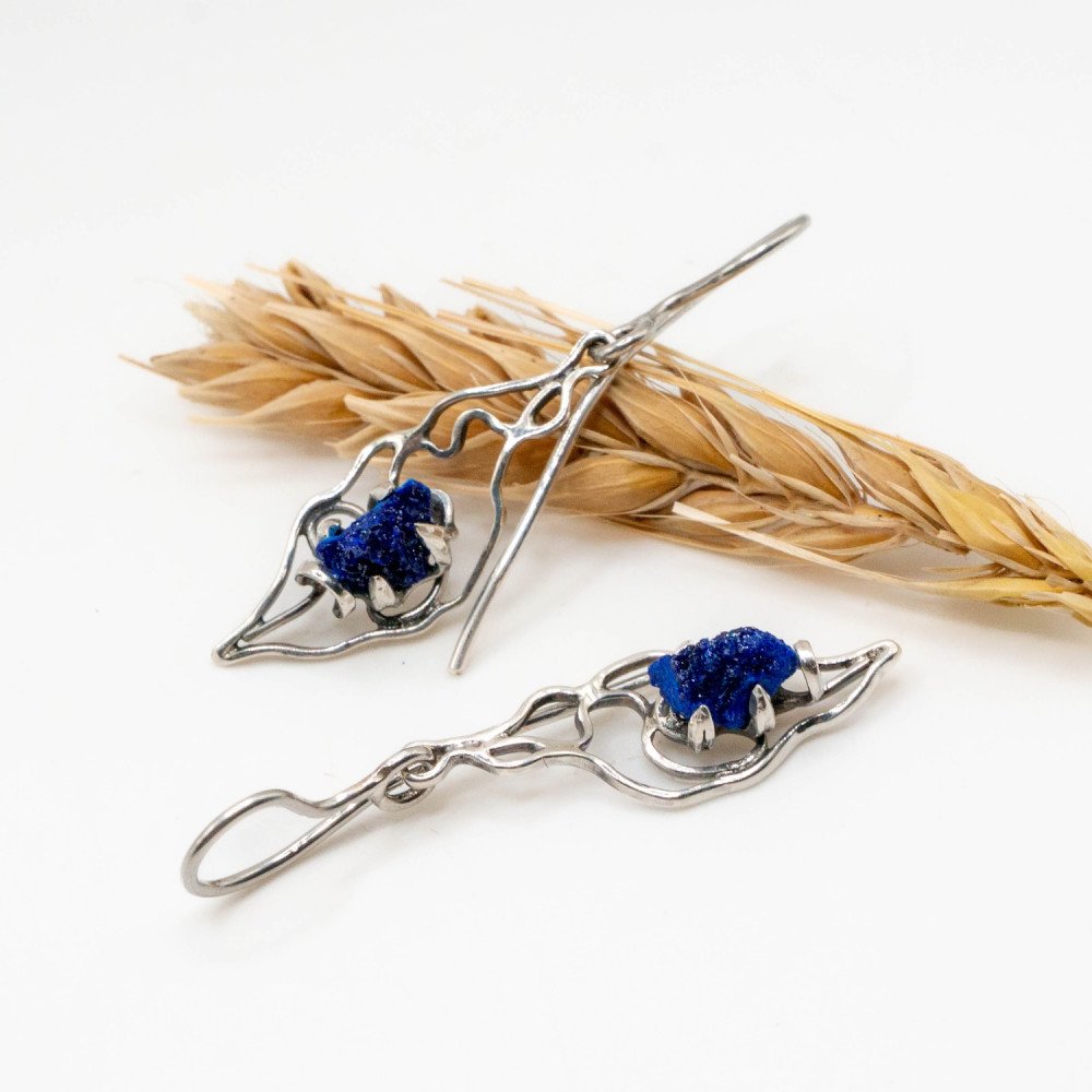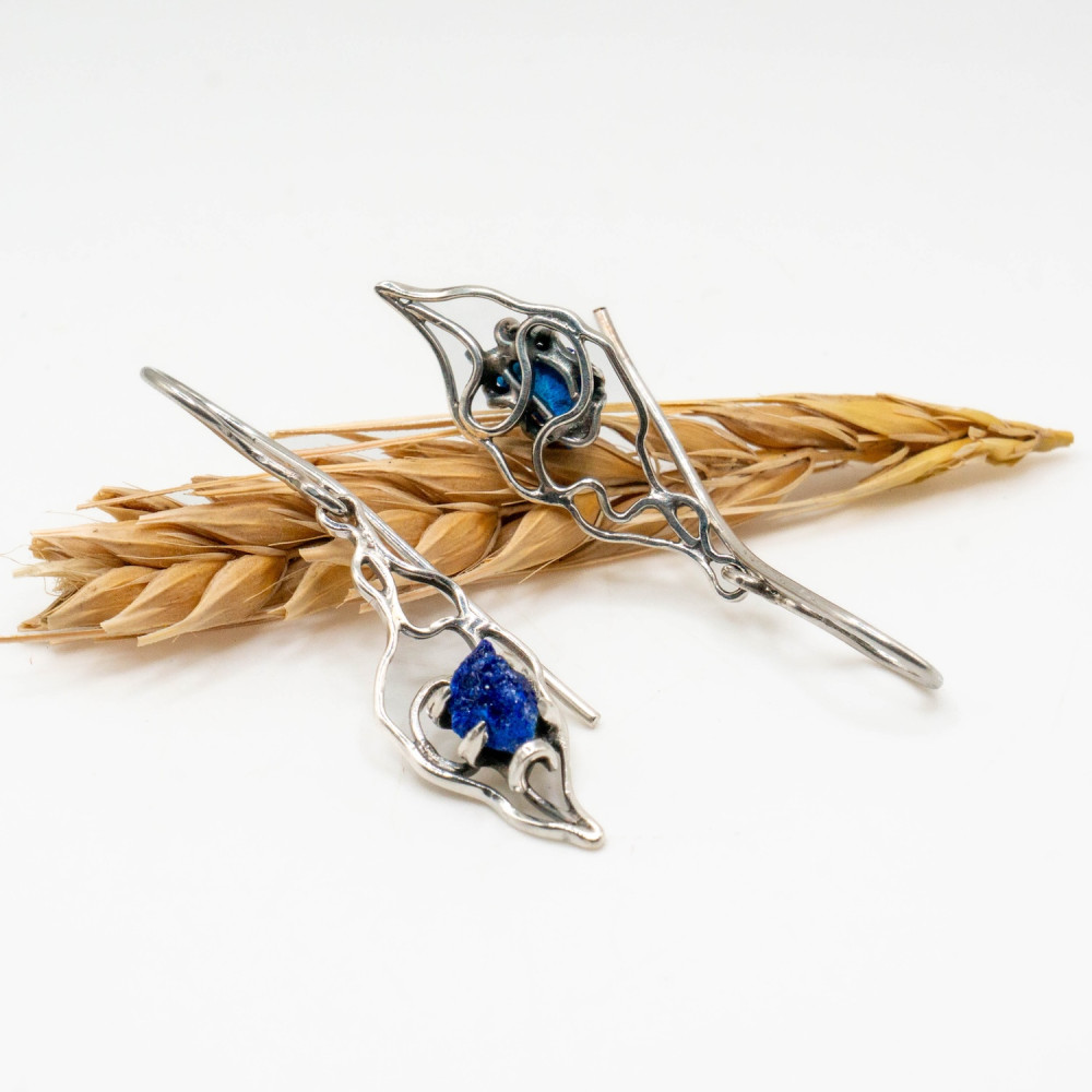 Ці сережки народжені на межі природи й мистецтва. Холодний блиск срібла огортає необроблений азурит, ніби фіксуючи мить його дикої краси. Органічний дизайн нагадує природні форми — коріння, тріщини в камені, лінії, створені не інструментом, а часом. Фактура металу — кована, з легкою нерівністю та патинуванням, що підкреслює нео-готичний характер прикраси. Камінь має природну, асиметричну форму, без огранювання — він живий, справжній, з глибоким синім кольором, який неможливо повторити.
