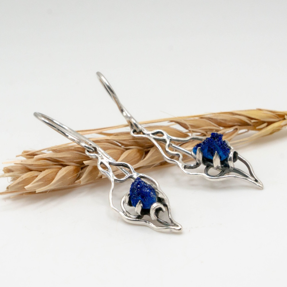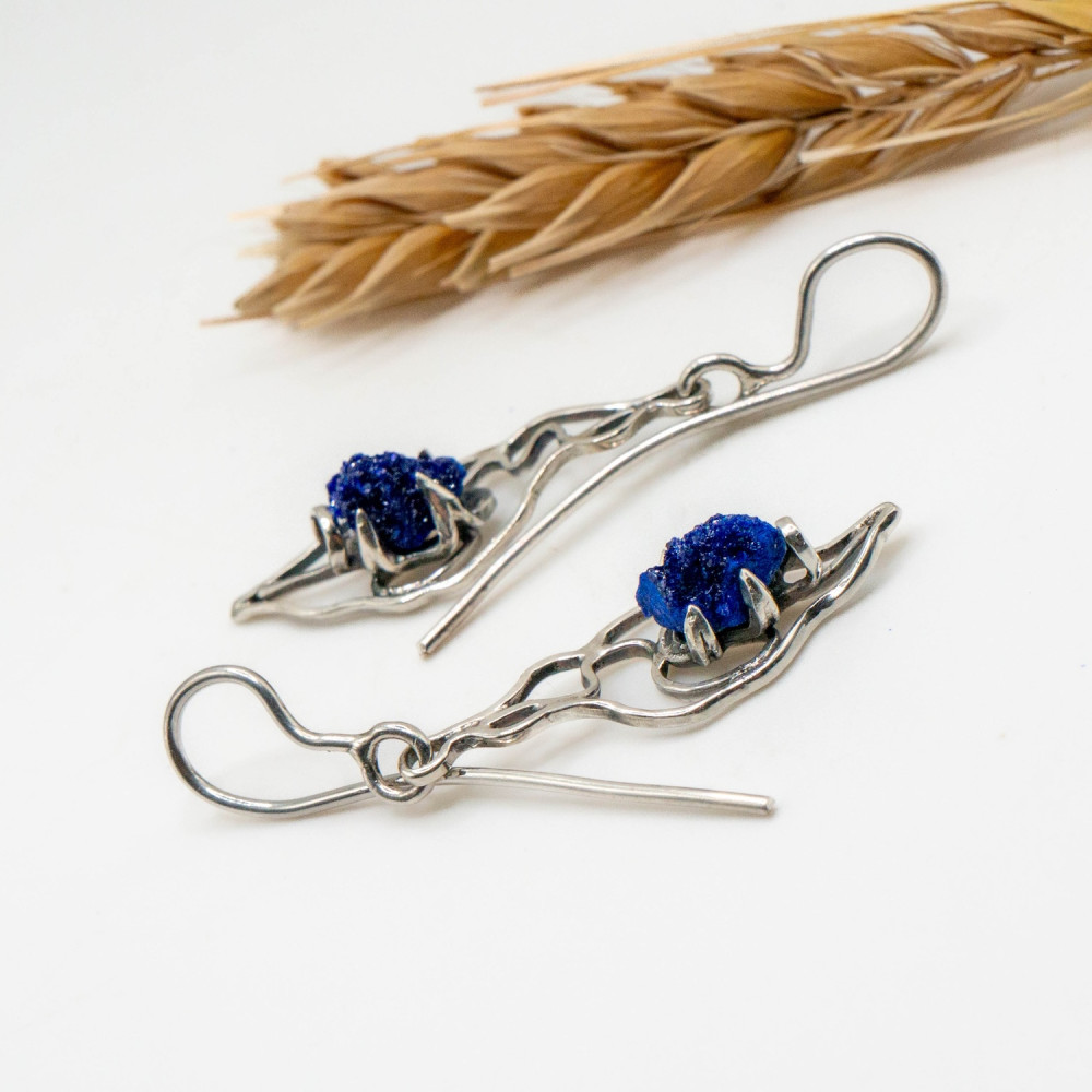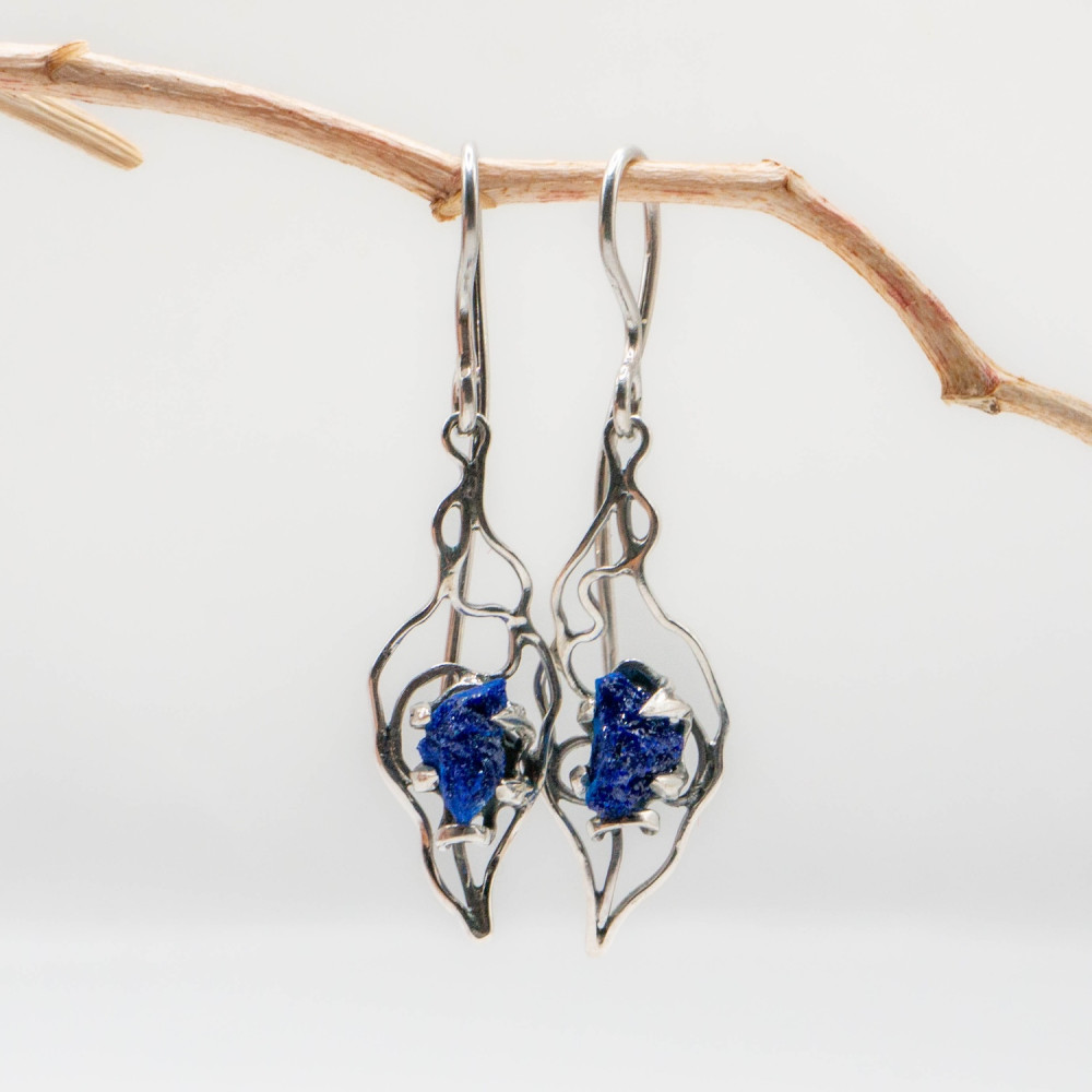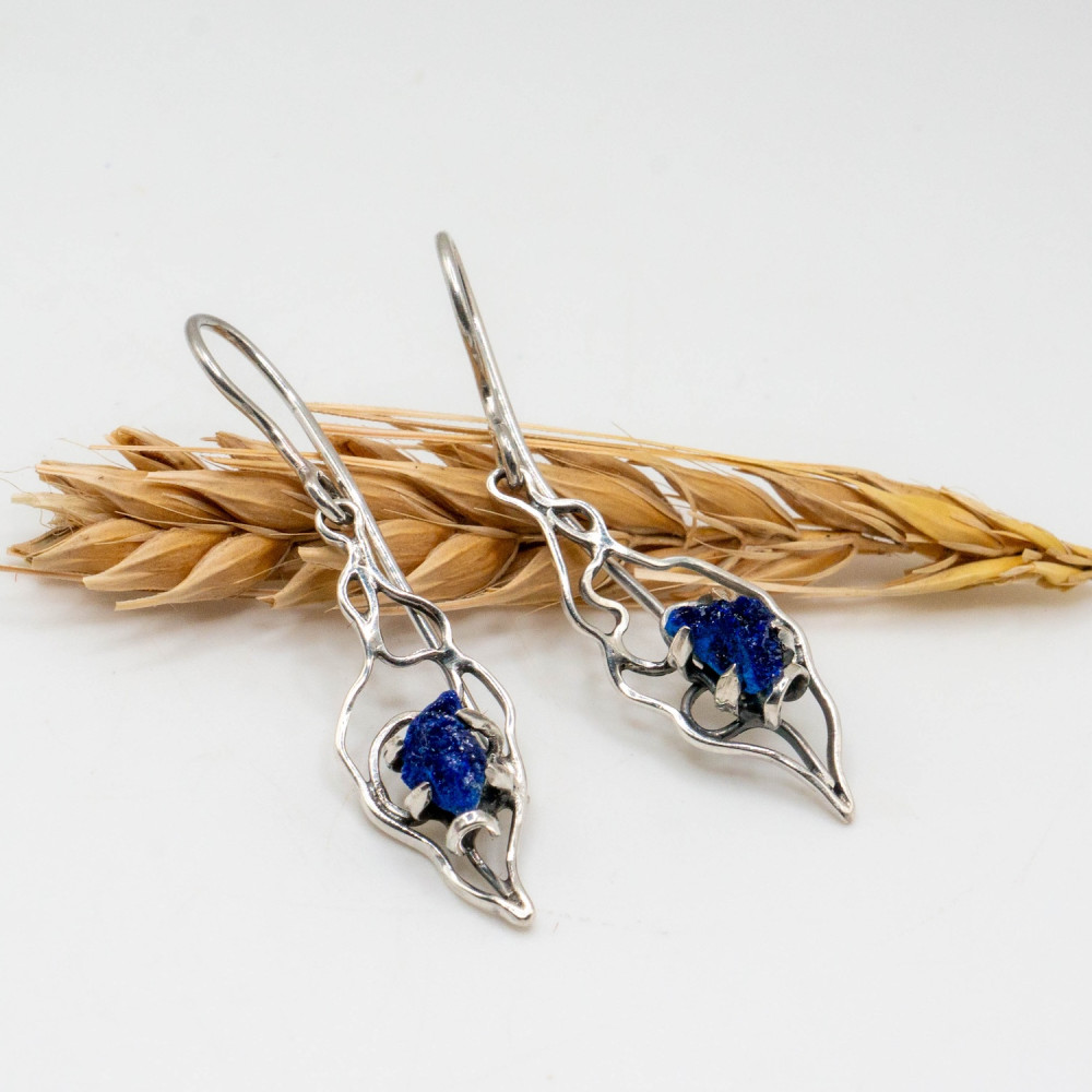 Ці сережки народжені на межі природи й мистецтва. Холодний блиск срібла огортає необроблений азурит, ніби фіксуючи мить його дикої краси. Органічний дизайн нагадує природні форми — коріння, тріщини в камені, лінії, створені не інструментом, а часом. Фактура металу — кована, з легкою нерівністю та патинуванням, що підкреслює нео-готичний характер прикраси. Камінь має природну, асиметричну форму, без огранювання — він живий, справжній, з глибоким синім кольором, який неможливо повторити.