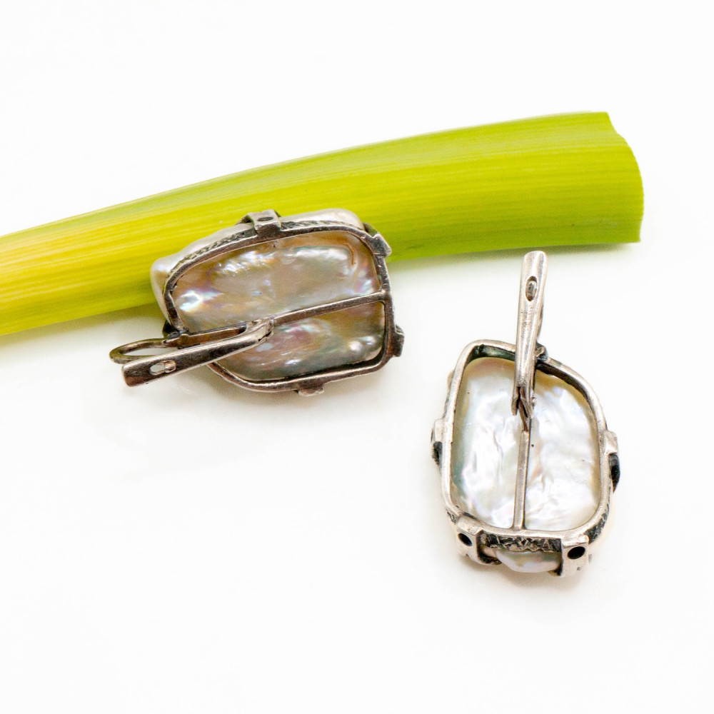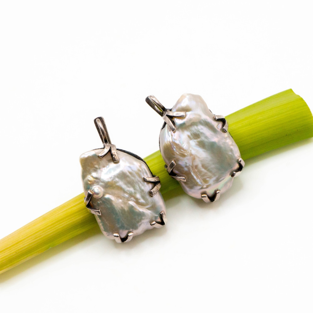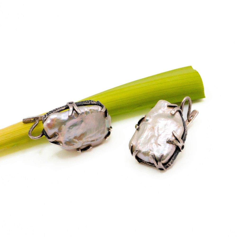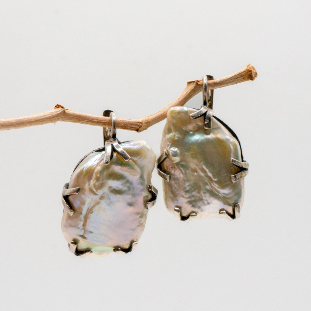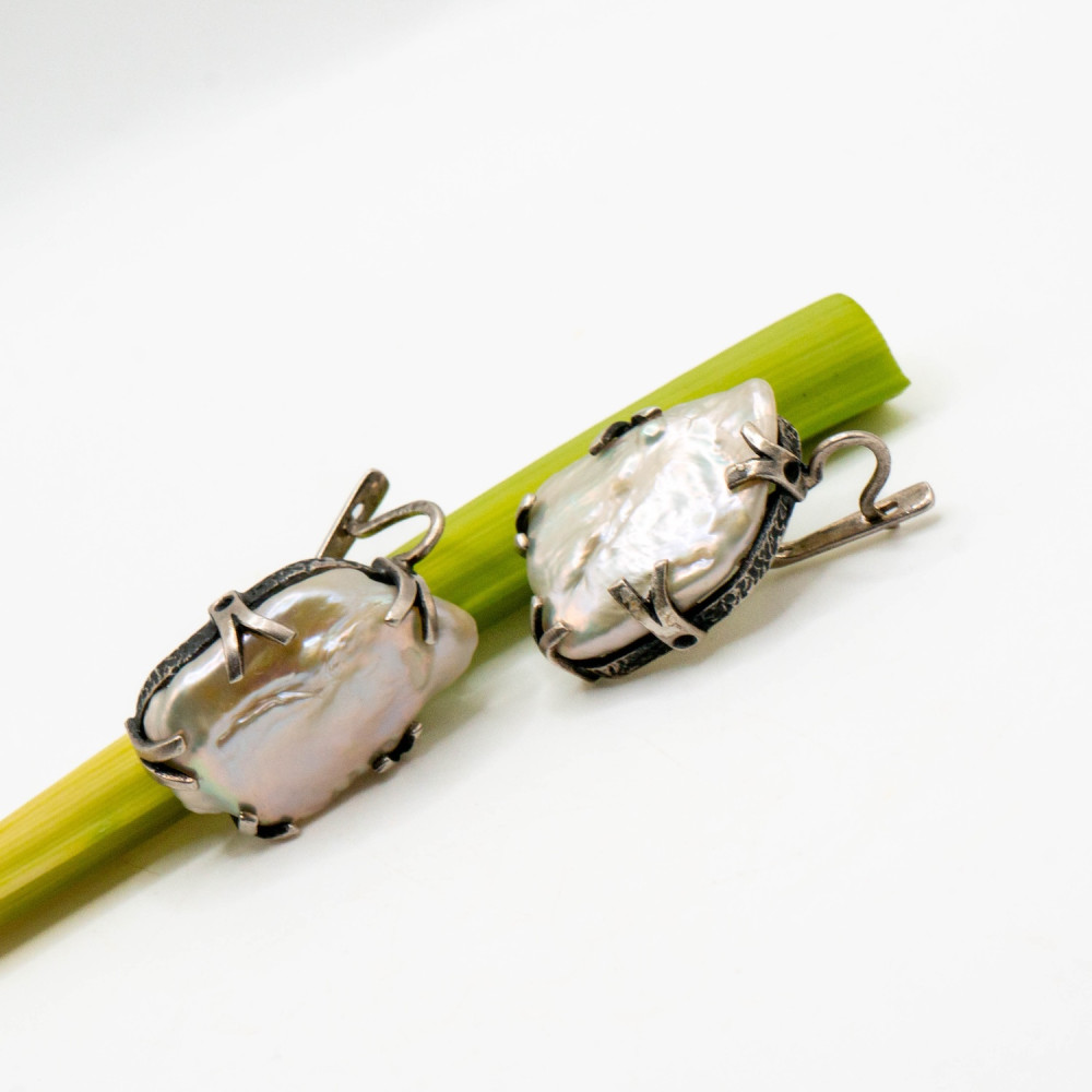 Ці сережки — продовження ідеї живої форми, де прикраса не підлаштовується під правила, а створює власні. Барокові перли різної, природно асиметричної форми закріплені у сріблі з виразною кованою фактурою. Метал має легку зморщеність і патиновані заглиблення, що підкреслюють ручну роботу та скульптурний характер дизайну. Срібні “лапки” утримують перли без спроб їх приборкати — лише делікатно фіксують, залишаючи камінню право бути собою. Органічний дизайн робить ці сережки виразним акцентом, а не просто доповненням образу.