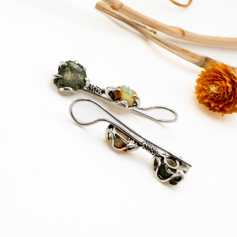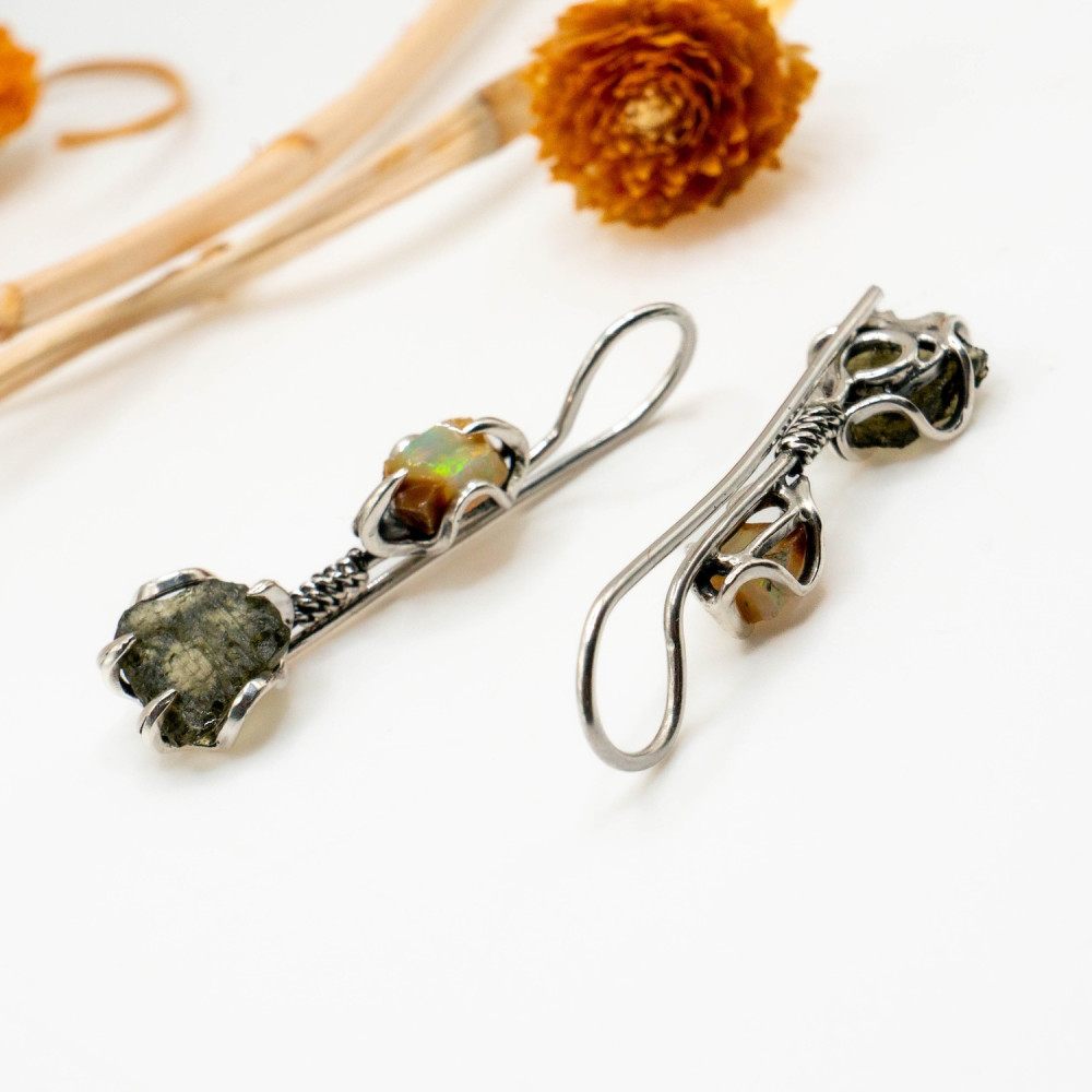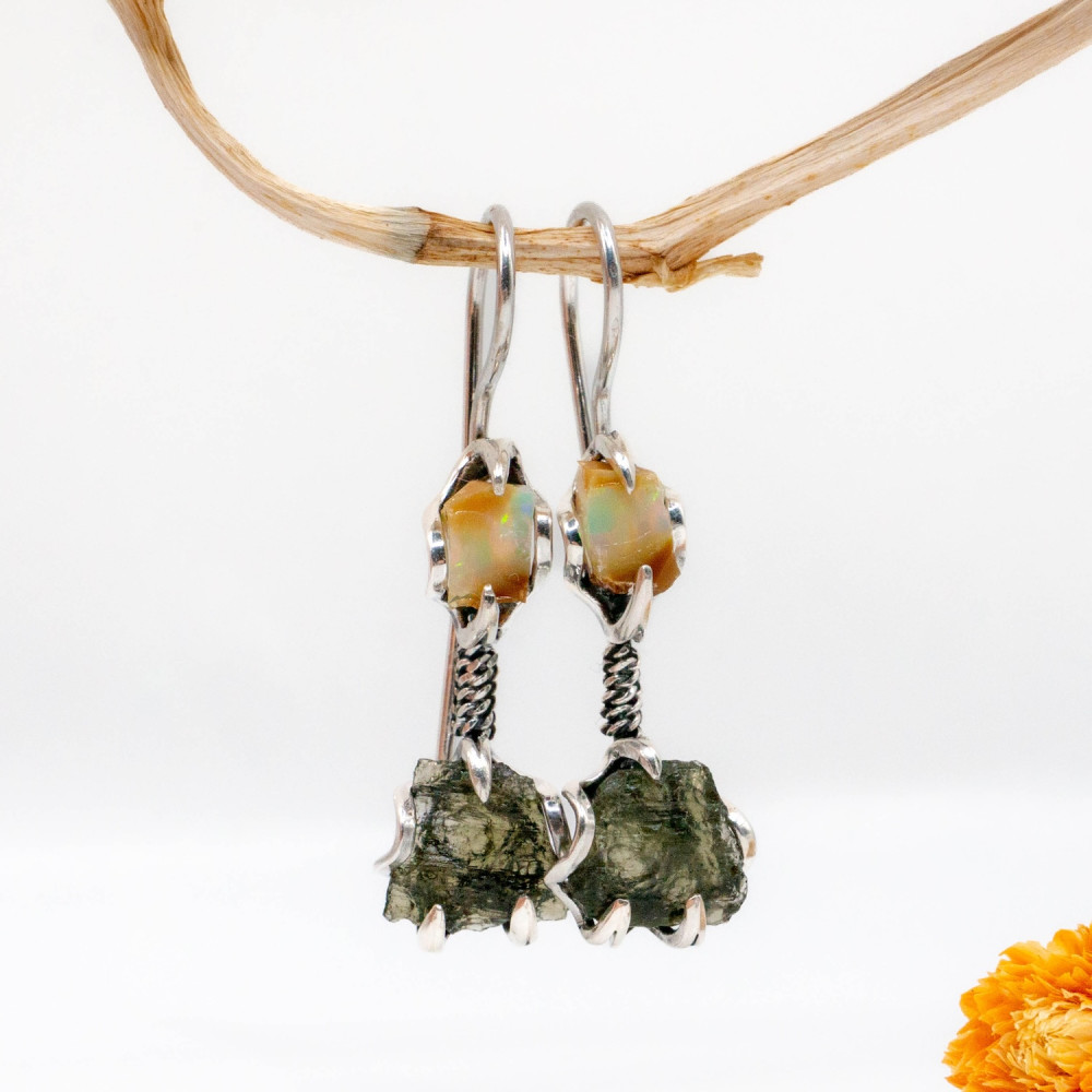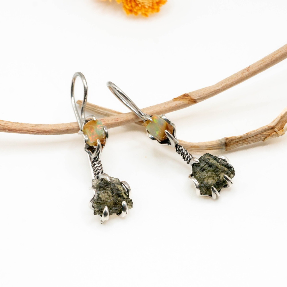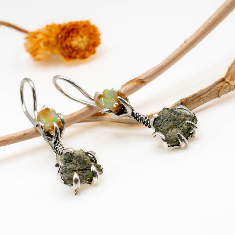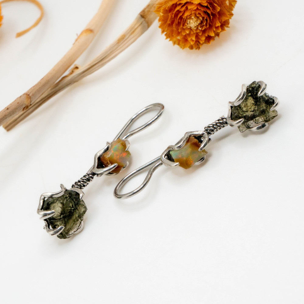 Натуральний опал у верхній частині сережок світиться внутрішніми спалахами жовто-зелених і помаранчевих відтінків, реагуючи на кожен рух. Його гладка, природна поверхня контрастує з сирою фактурою молдавиту — рідкісного природного мінералу метеоритного походження. Молдавит збережений у необробленій формі: з виразною, шорсткою текстурою та темно-зеленим, майже графітовим кольором. Разом ці камені створюють відчуття глибокої магії та внутрішньої сили.