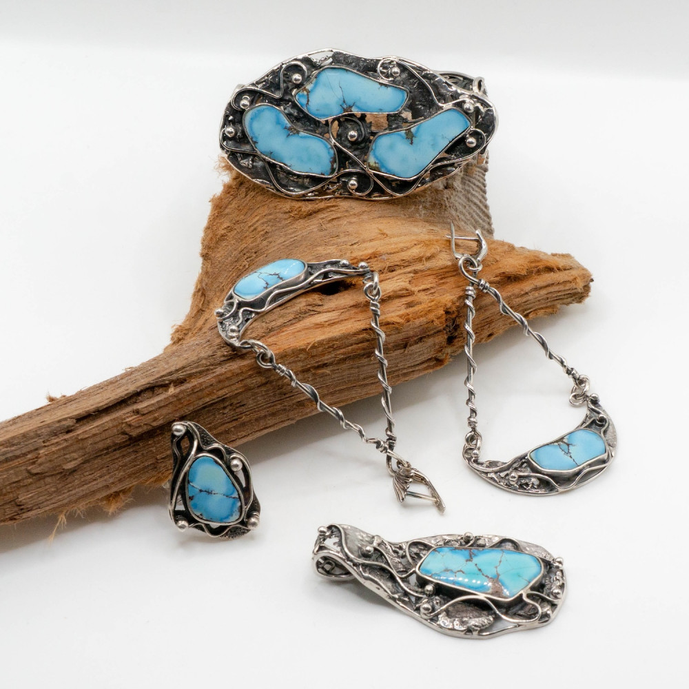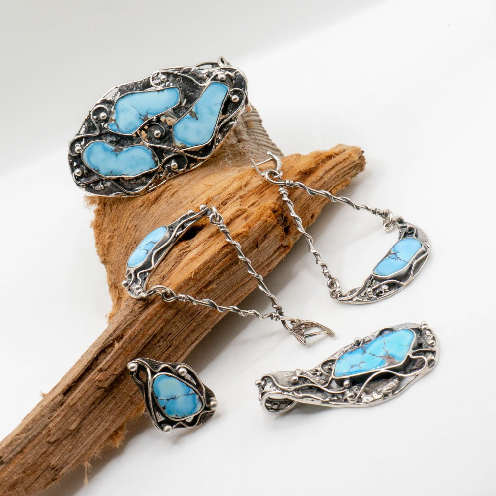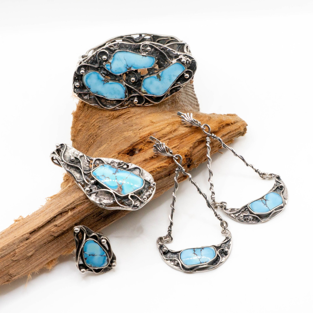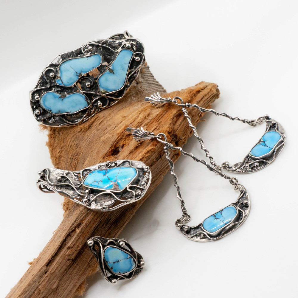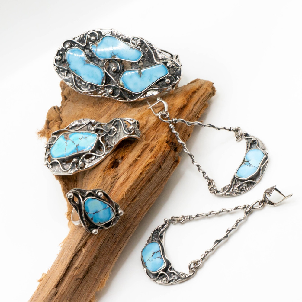 Цей срібний комплект з бірюзою — як цілісна історія, розказана мовою металу й каменю. Масивний браслет, кулон, сережки та кільце поєднані єдиним органічним ритмом, у якому відчувається сила землі та спокій неба. Фактурне срібло ніби зберігає сліди часу, а натуральна бірюза стає центром композиції — живою, глибокою, справжньою. Це не просто прикраси, а wearable art для тих, хто відчуває красу на інтуїтивному рівні.