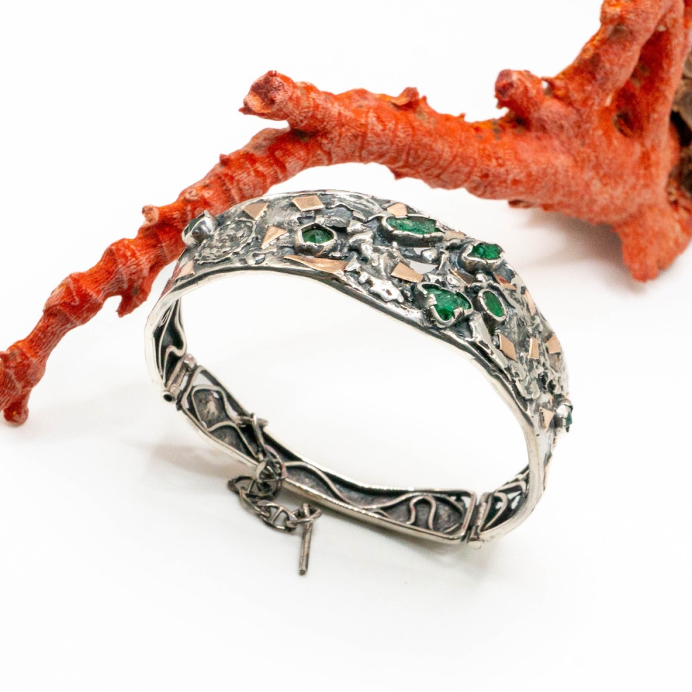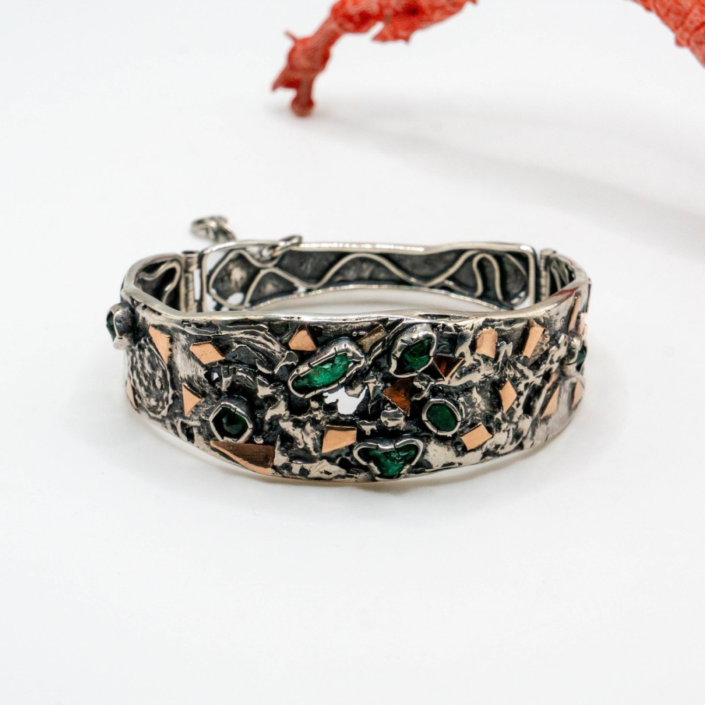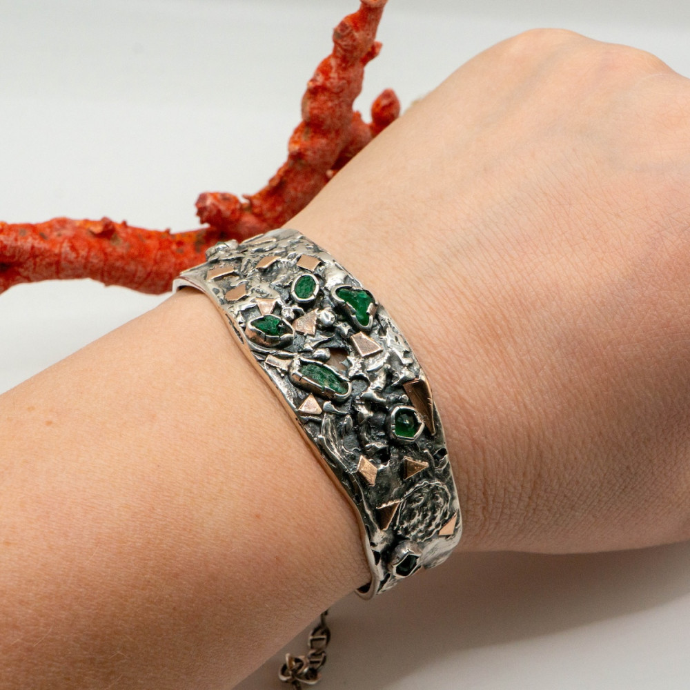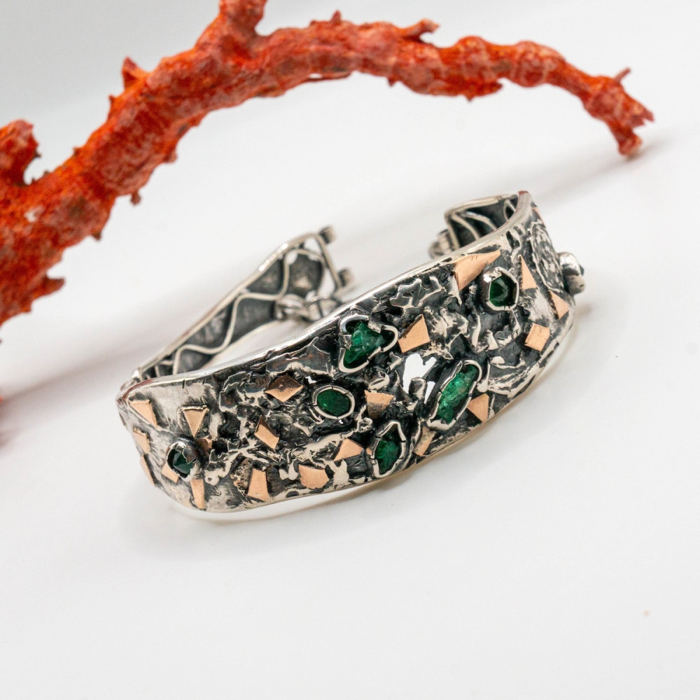 Срібний браслет із золотими акцентами та натуральними смарагдами, виконаний вручну, — прикраса з характером і статусом. Глибокий зелений колір смарагдів підкреслює шляхетний блиск срібла, а теплі золоті деталі додають відчуття розкоші та завершеності. Кожен елемент створений вручну, тож браслет існує в єдиному екземплярі та ідеально підійде тим, хто цінує авторський дизайн, якість і прикраси з душею.