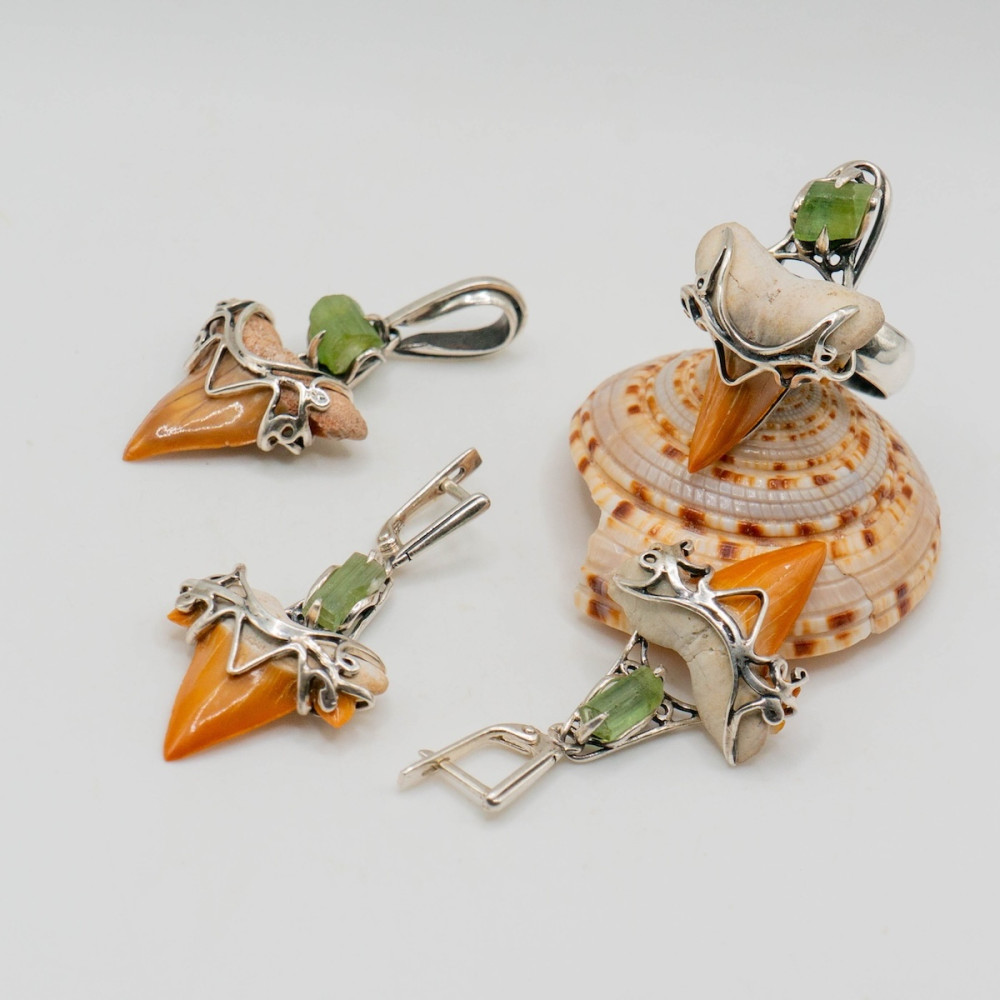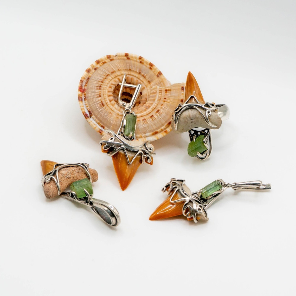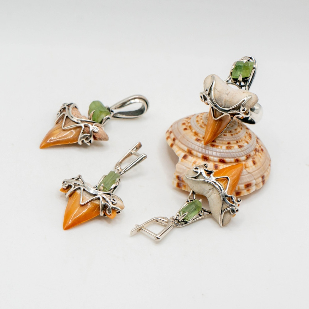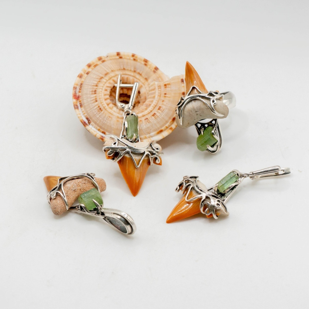 Срібний комплект з турмаліном та зубом акули