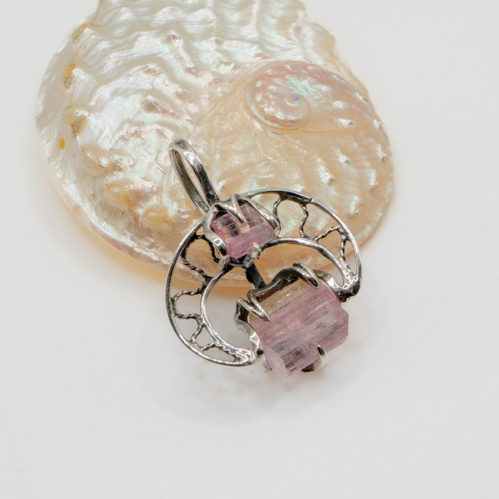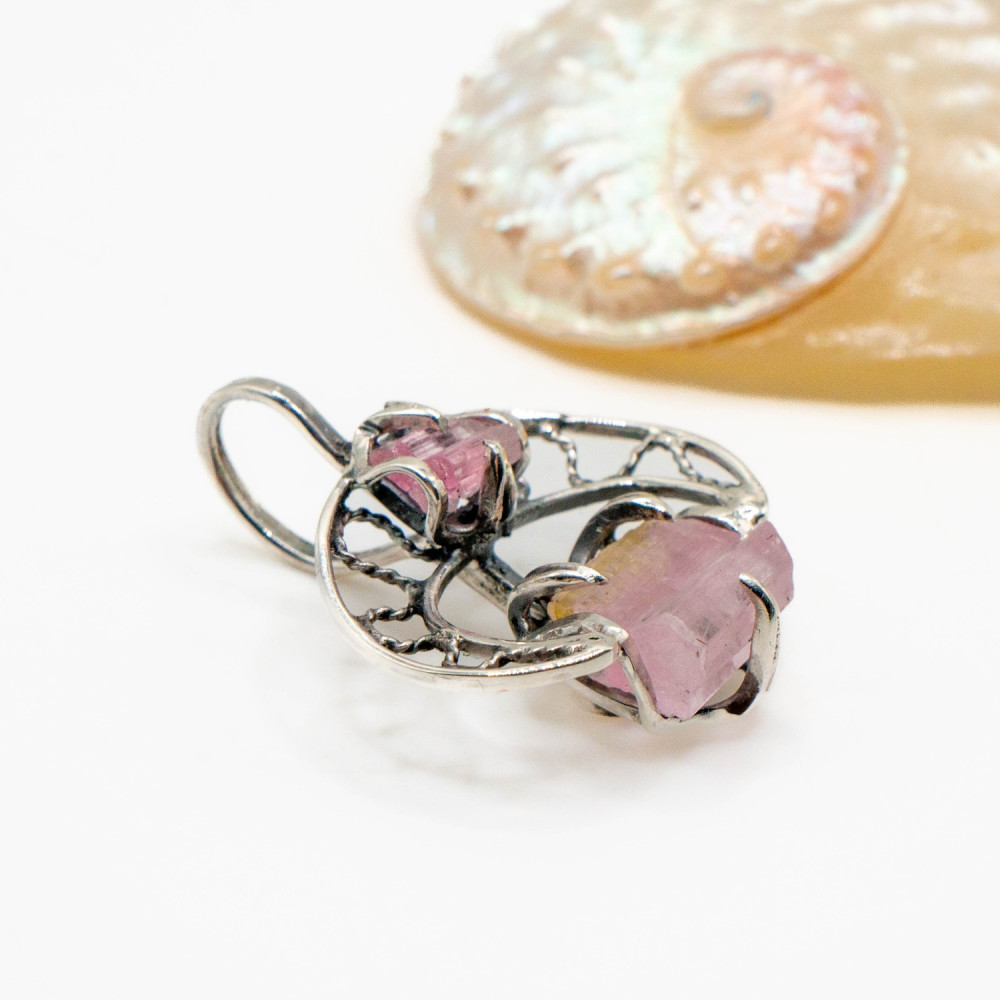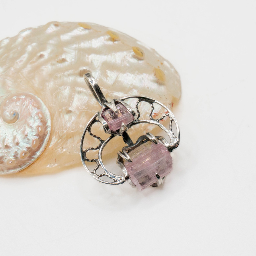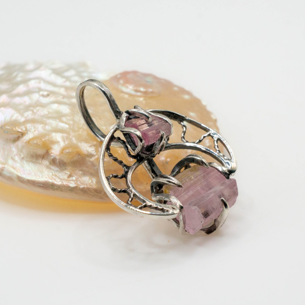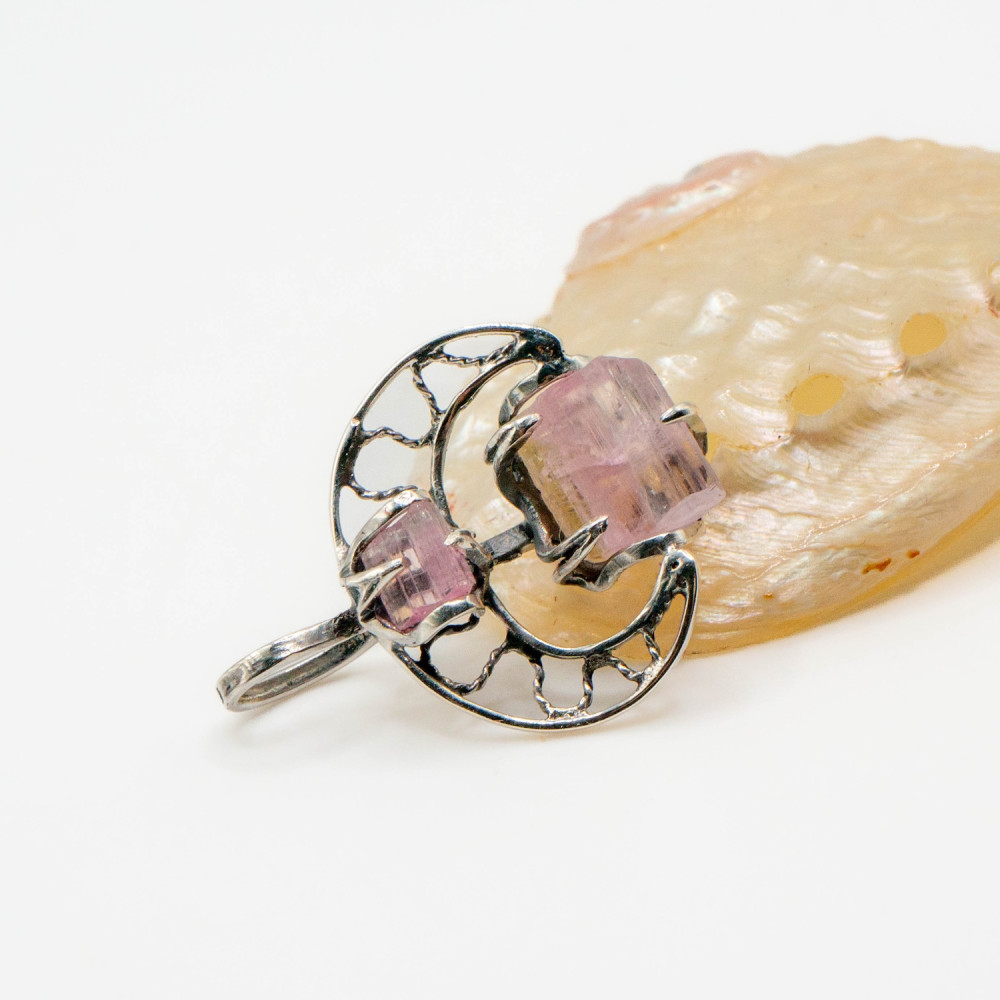 Цей кулон побудований як розмова двох форм. Два кристали рожевого турмаліну — різні за розміром, але єдині за ритмом — поєднані в легкій, відкритій срібній конструкції. Вони не змагаються між собою, а співіснують, створюючи відчуття внутрішньої рівноваги. Органічний дизайн підкреслює природну геометрію каменю, залишаючи простір для світла, повітря й руху.