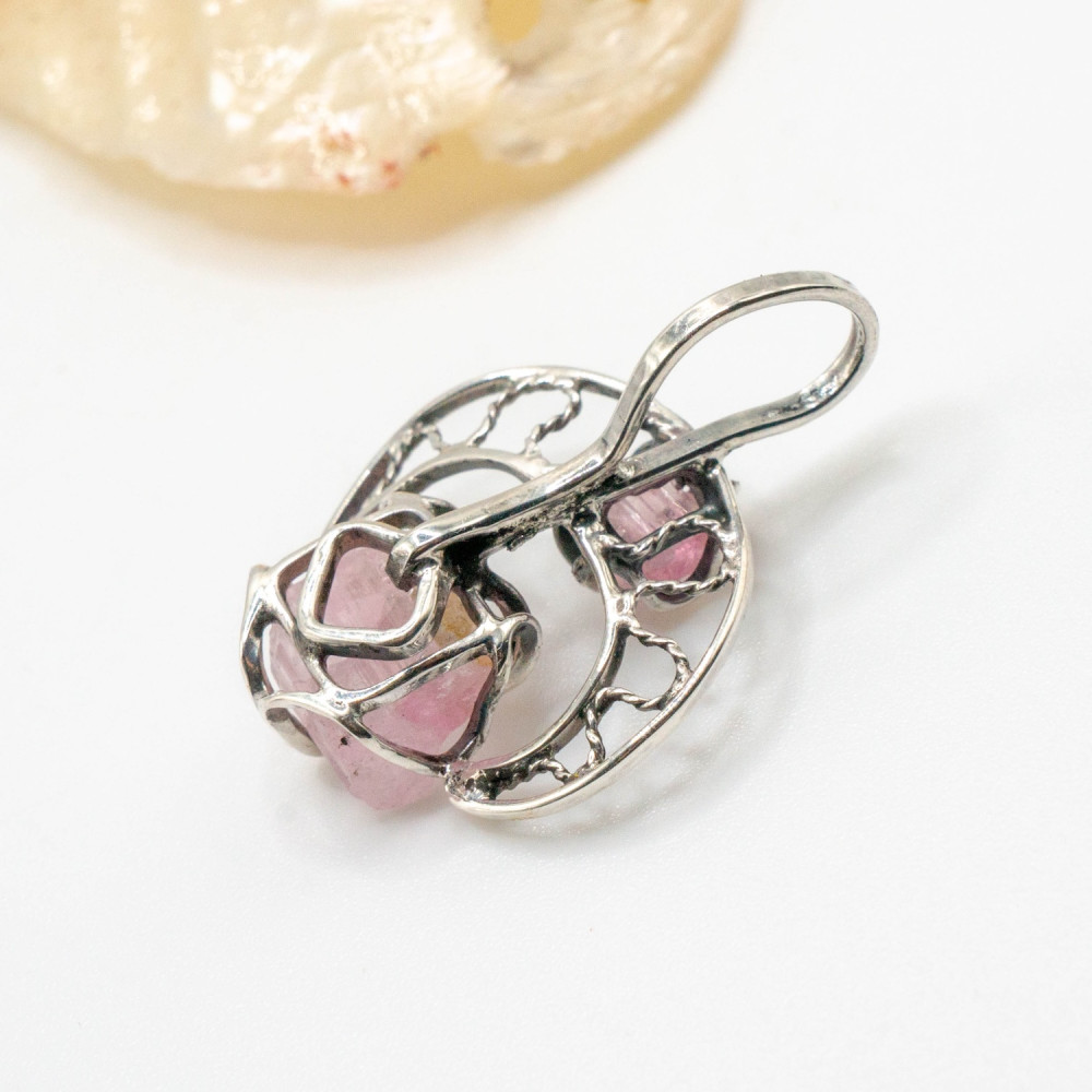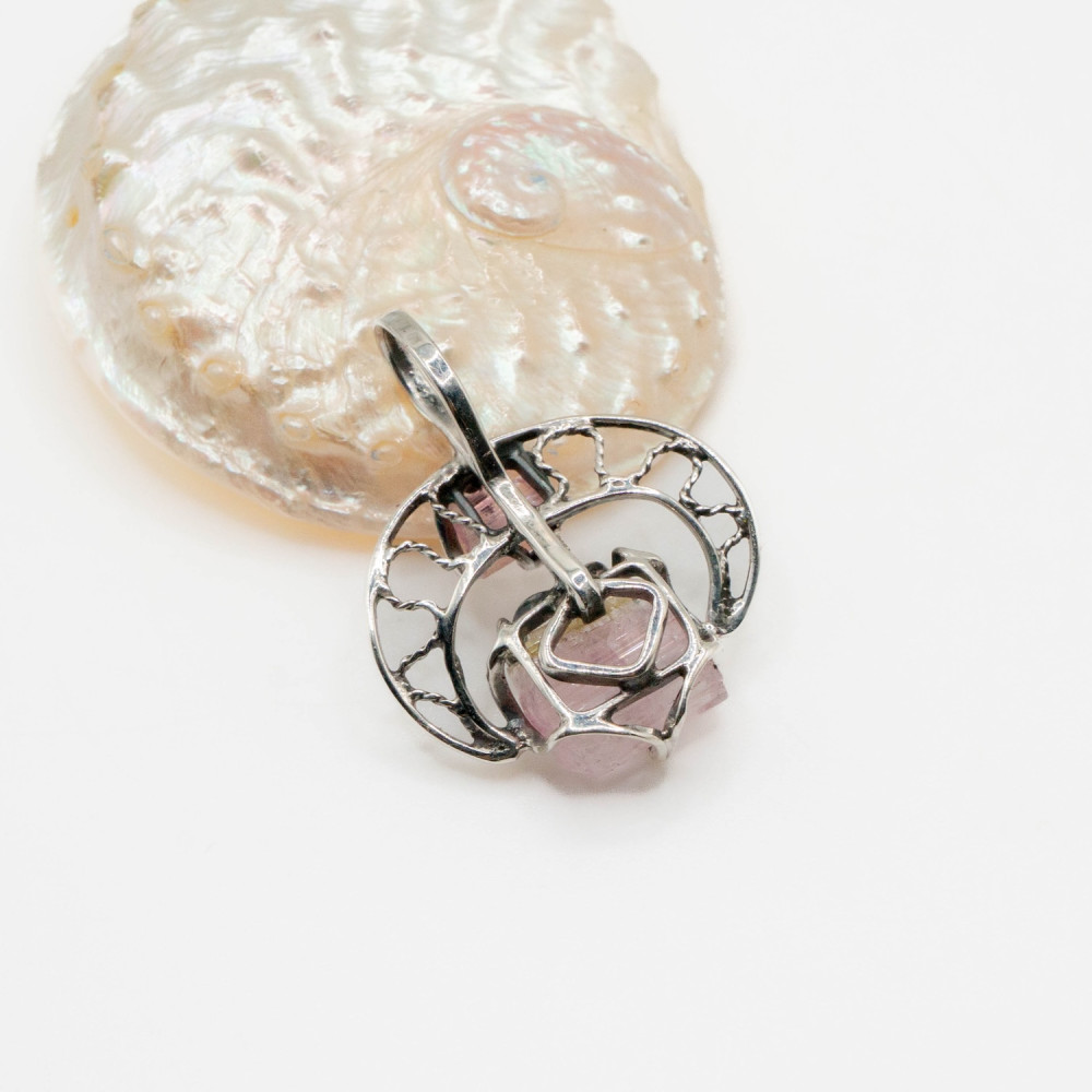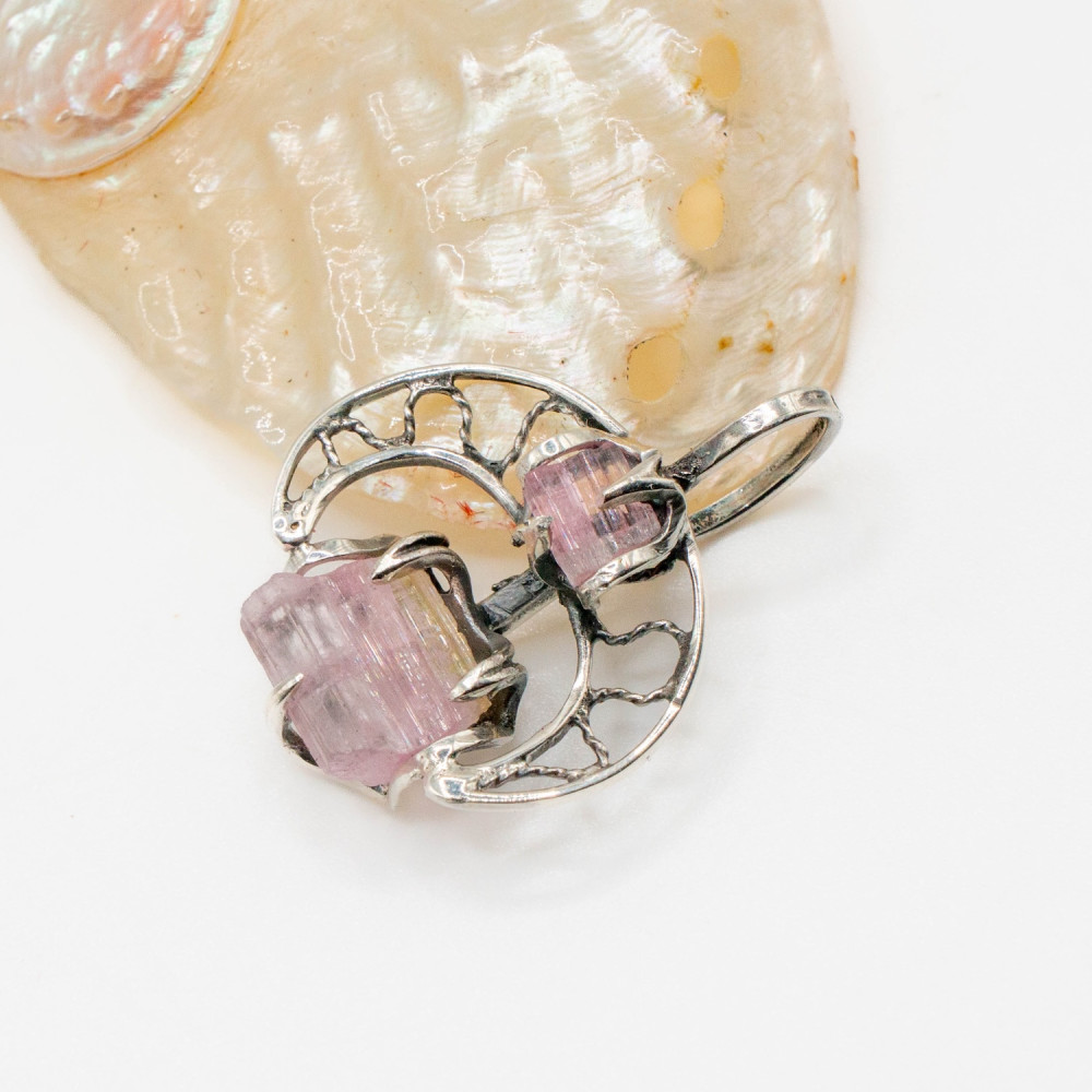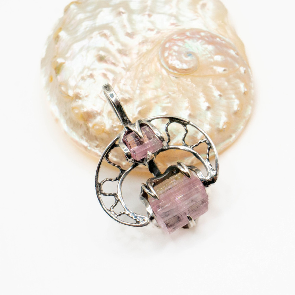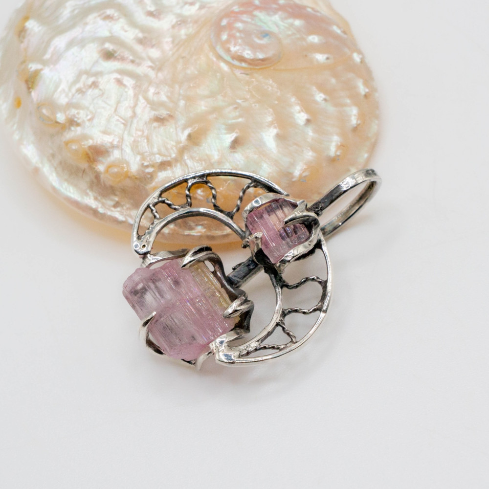 Цей кулон побудований як розмова двох форм. Два кристали рожевого турмаліну — різні за розміром, але єдині за ритмом — поєднані в легкій, відкритій срібній конструкції. Вони не змагаються між собою, а співіснують, створюючи відчуття внутрішньої рівноваги. Органічний дизайн підкреслює природну геометрію каменю, залишаючи простір для світла, повітря й руху.