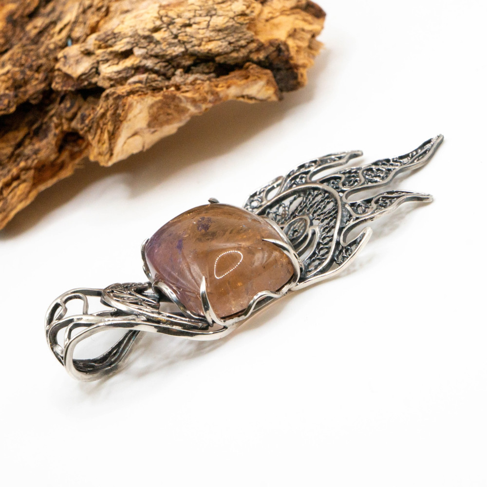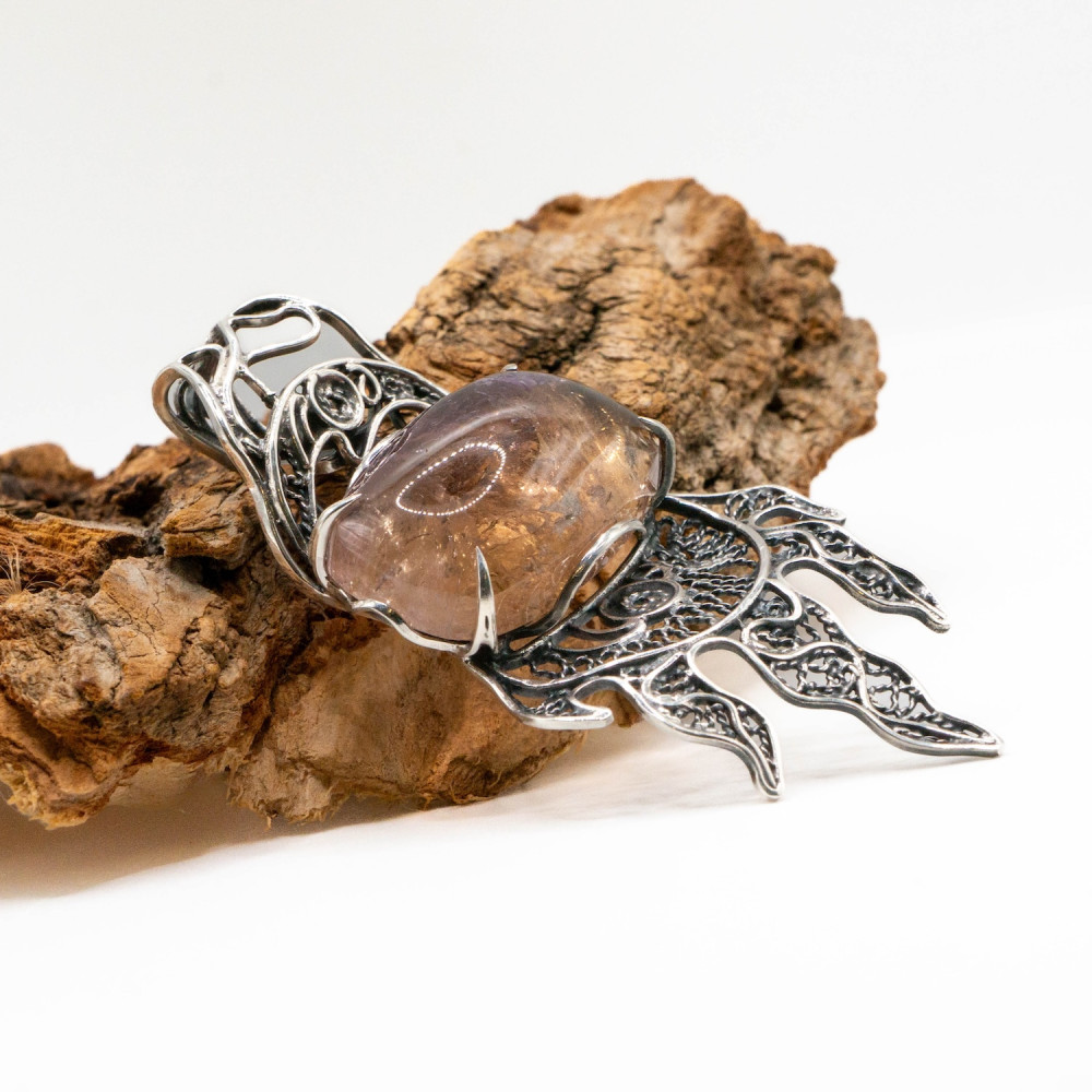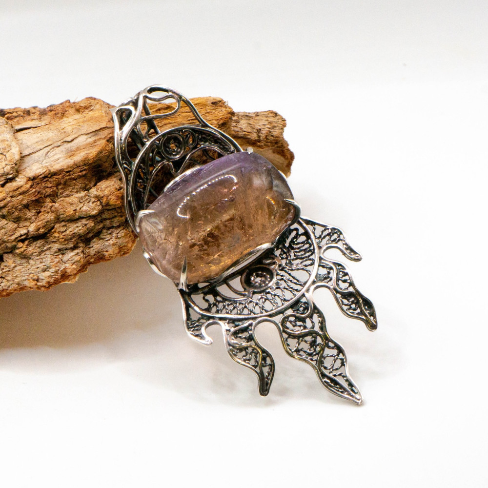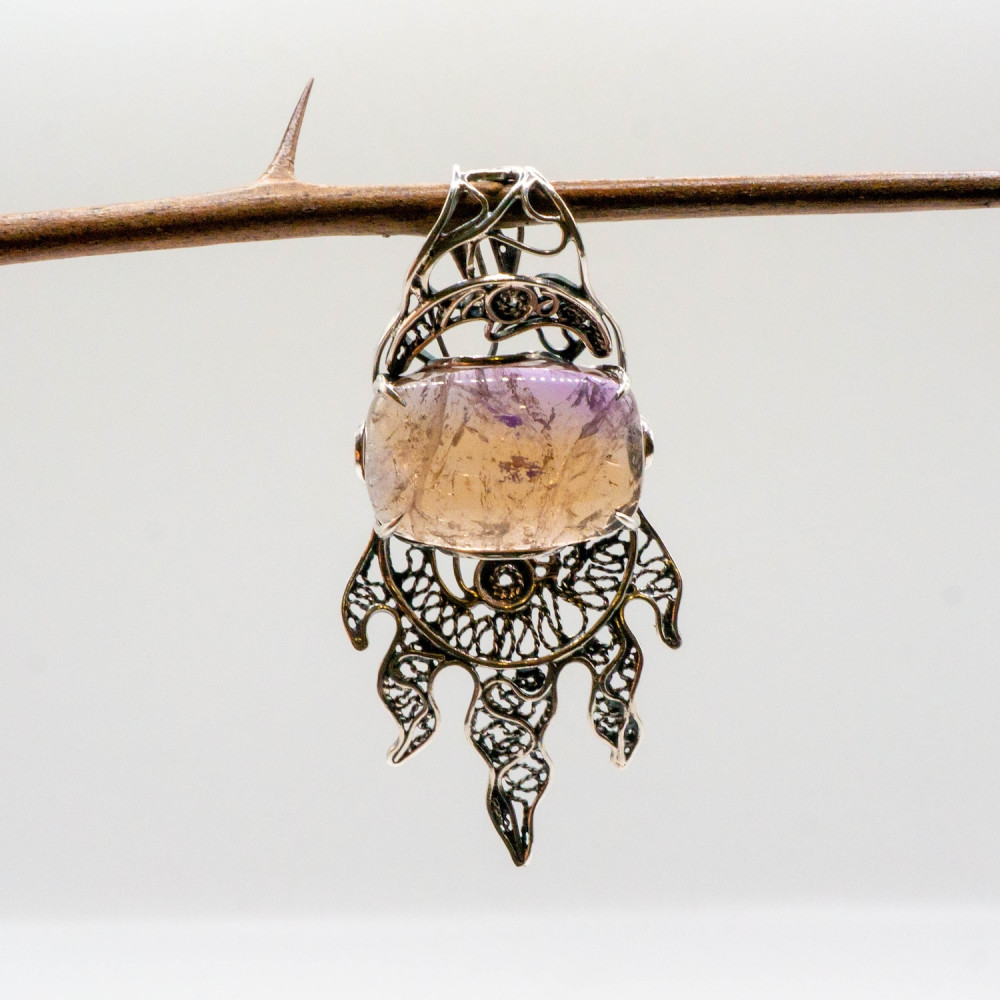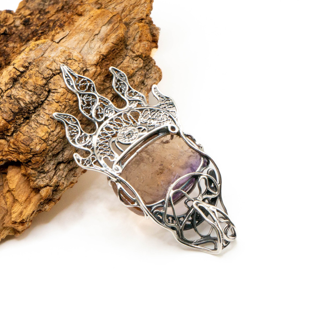 Цей кулон нагадує древній символ сили, ніби піднятий із глибин землі та зафіксований у сріблі. Центральний аметрин має природну, м’яко заокруглену форму кабошона з внутрішніми переливами та включеннями, що створюють ефект живої глибини. У камені зчитується складна гра відтінків — приглушений фіолет переходить у тепле, медово-золотисте світло. Срібна оправа виконана у виразному органічному дизайні: ковані, зморщені та мереживні елементи нагадують коріння, язики полум’я або давні символи захисту. Фактура металу багата й багатошарова, з контрастом гладких ліній і темного патинування. Це авторська прикраса, у якій природний мінерал і форма існують як єдине ціле — справжнє wearable art.