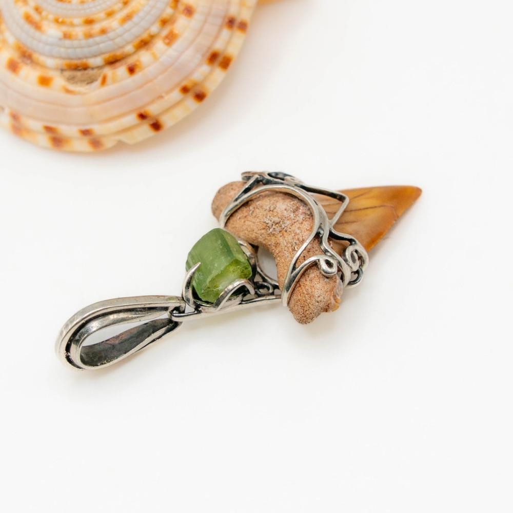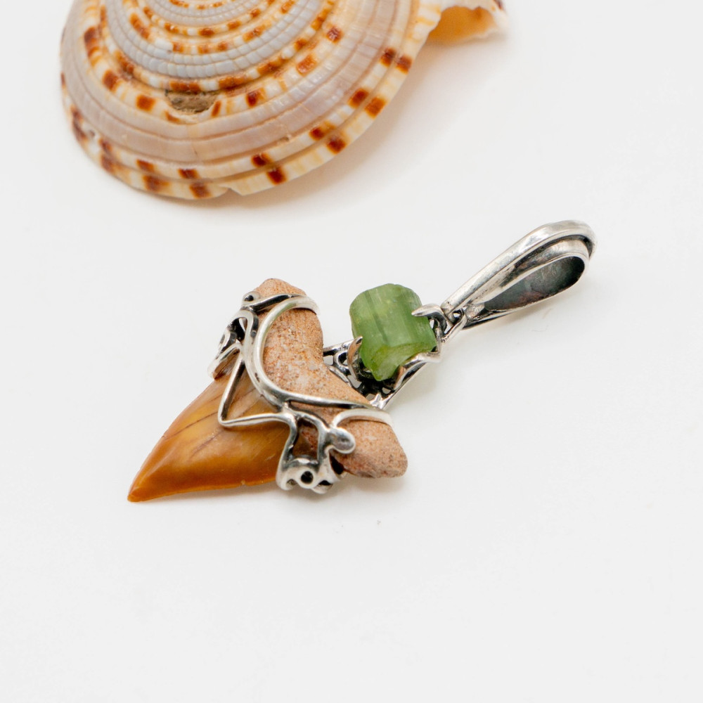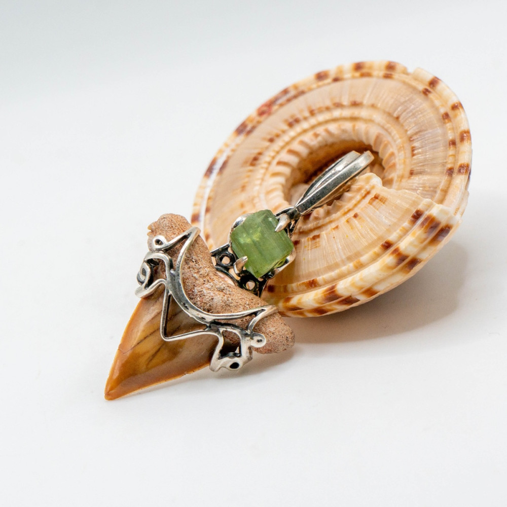 Унікальна авторська прикраса, що поєднує силу природи й мистецтво ювеліра. Зуб акули, оправлений у срібло, символізує захист і мужність, а природний зелений турмалін додає енергії та гармонії.