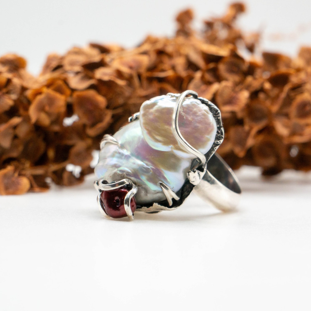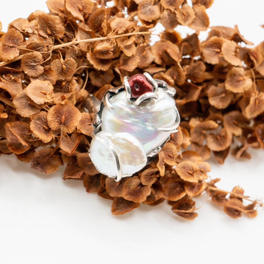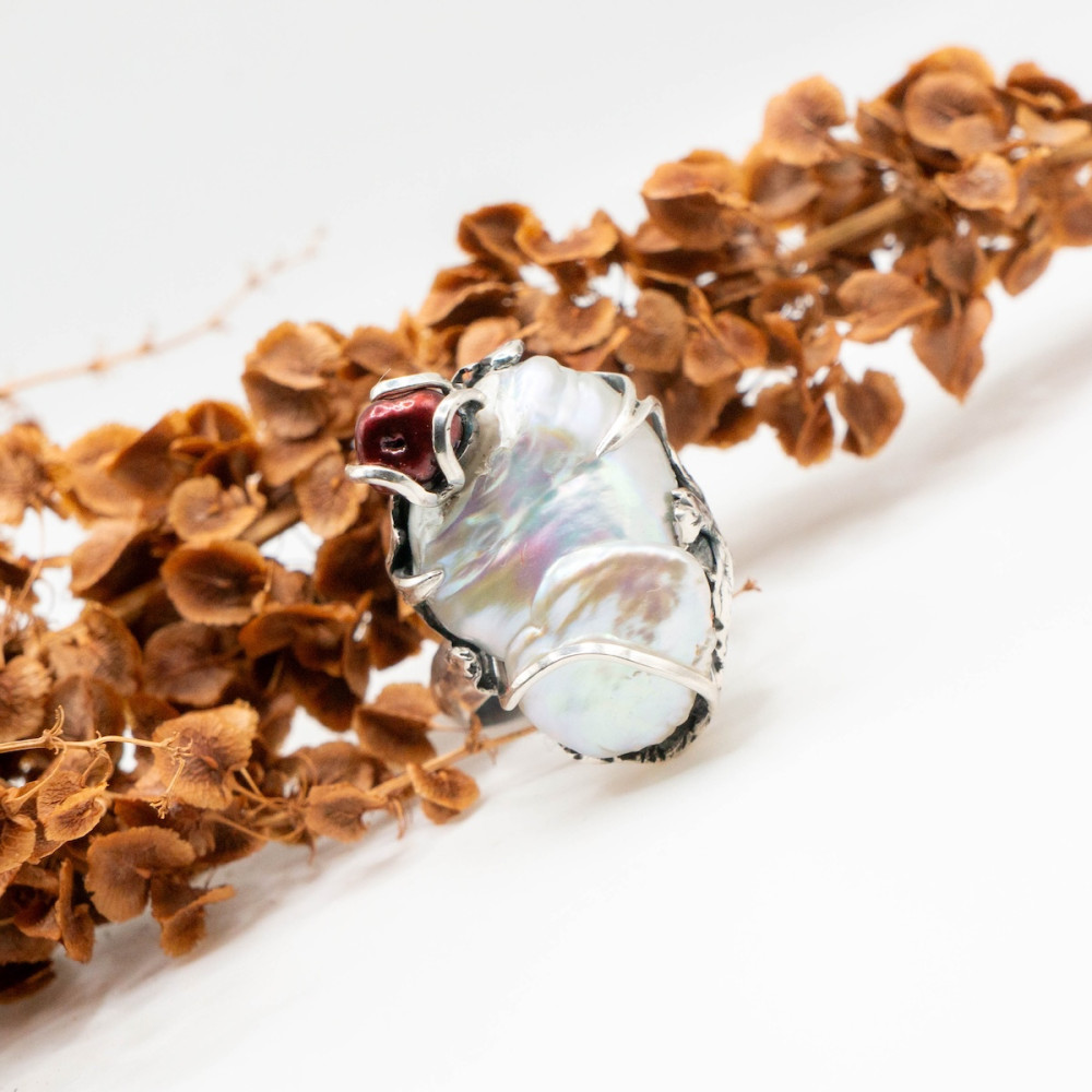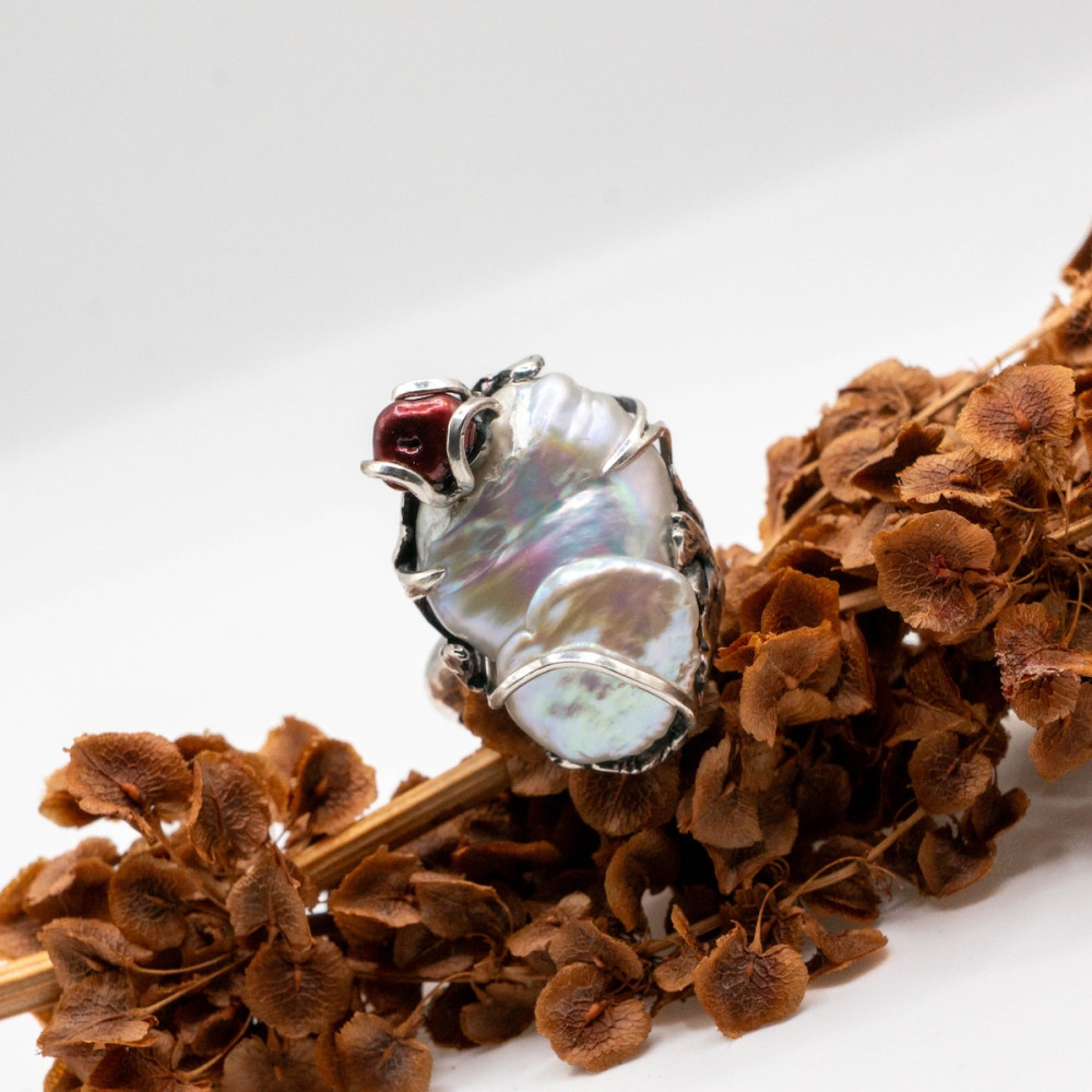 Ця каблучка — втілення витонченої гармонії. Два барочні перли, білий і чорний, немов дві протилежності, що чудово доповнюють одна одну. Білий світиться ніжним молочним сяйвом — чистим і спокійним. Чорний заворожує глибиною та загадковими переливами, наче маленький шматочок нічного неба.