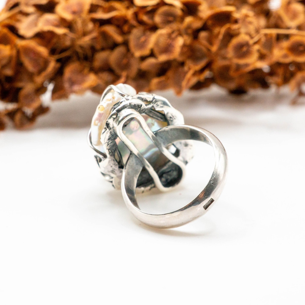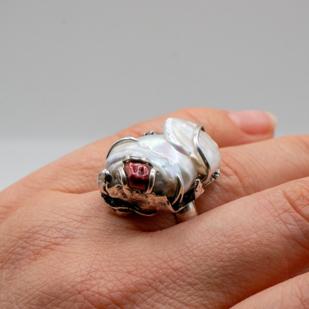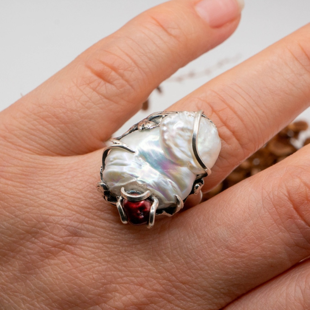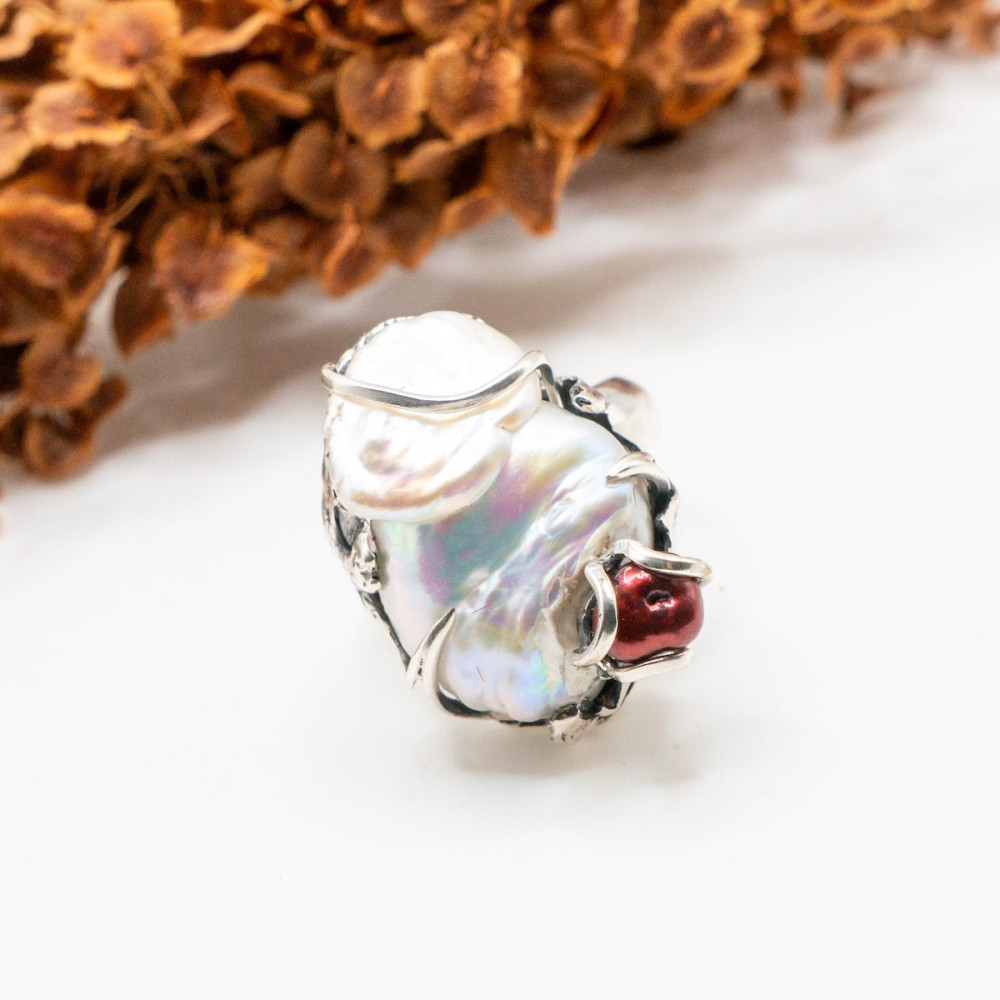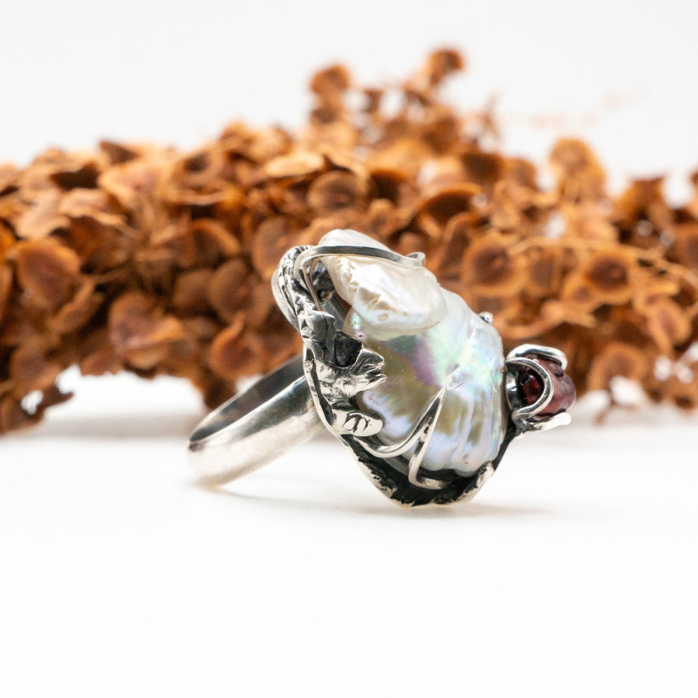 Ця каблучка — втілення витонченої гармонії. Два барочні перли, білий і чорний, немов дві протилежності, що чудово доповнюють одна одну. Білий світиться ніжним молочним сяйвом — чистим і спокійним. Чорний заворожує глибиною та загадковими переливами, наче маленький шматочок нічного неба.