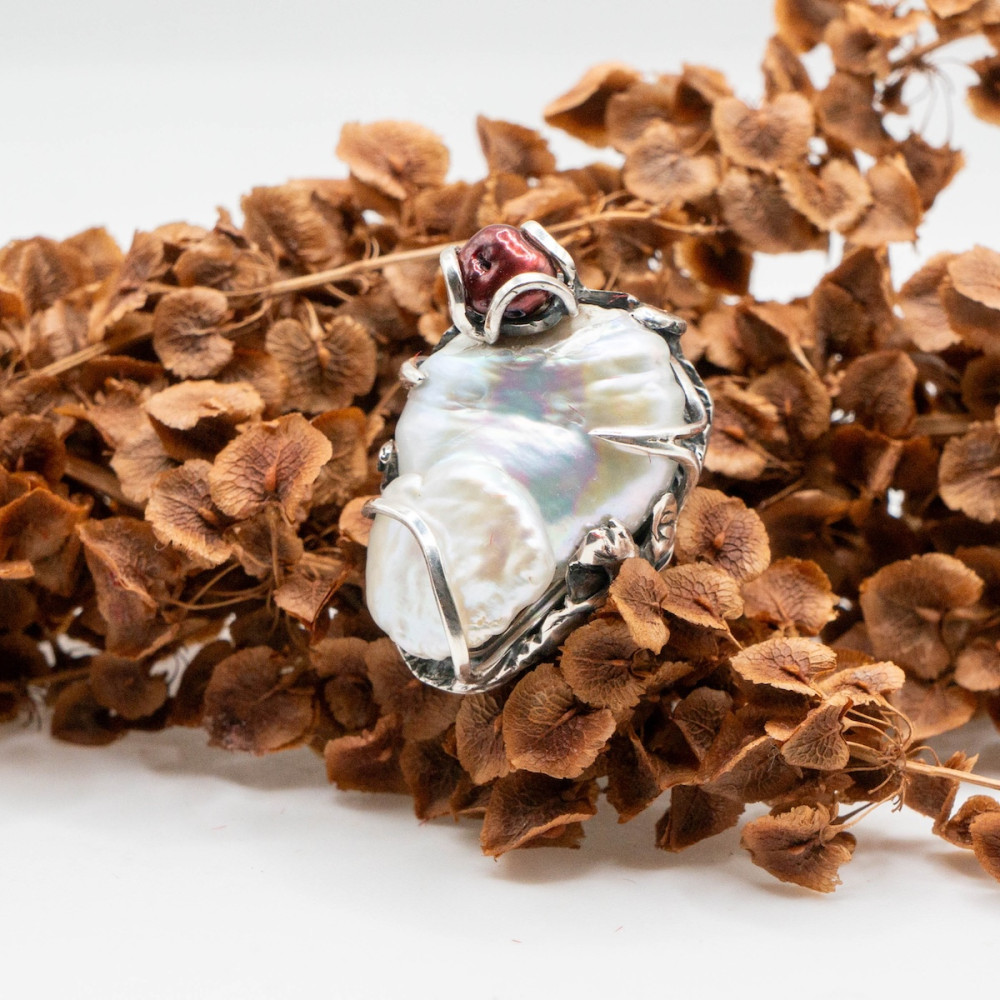 Срібло делікатно огортає перли, підкреслюючи їх природні лінії та унікальний характер. Прикраса виглядає незвично, елегантно і дуже виразно. Це поєднання ніжності та драматичності, світла й темряви для тих, хто обирає прикраси з глибиною та сенсом.