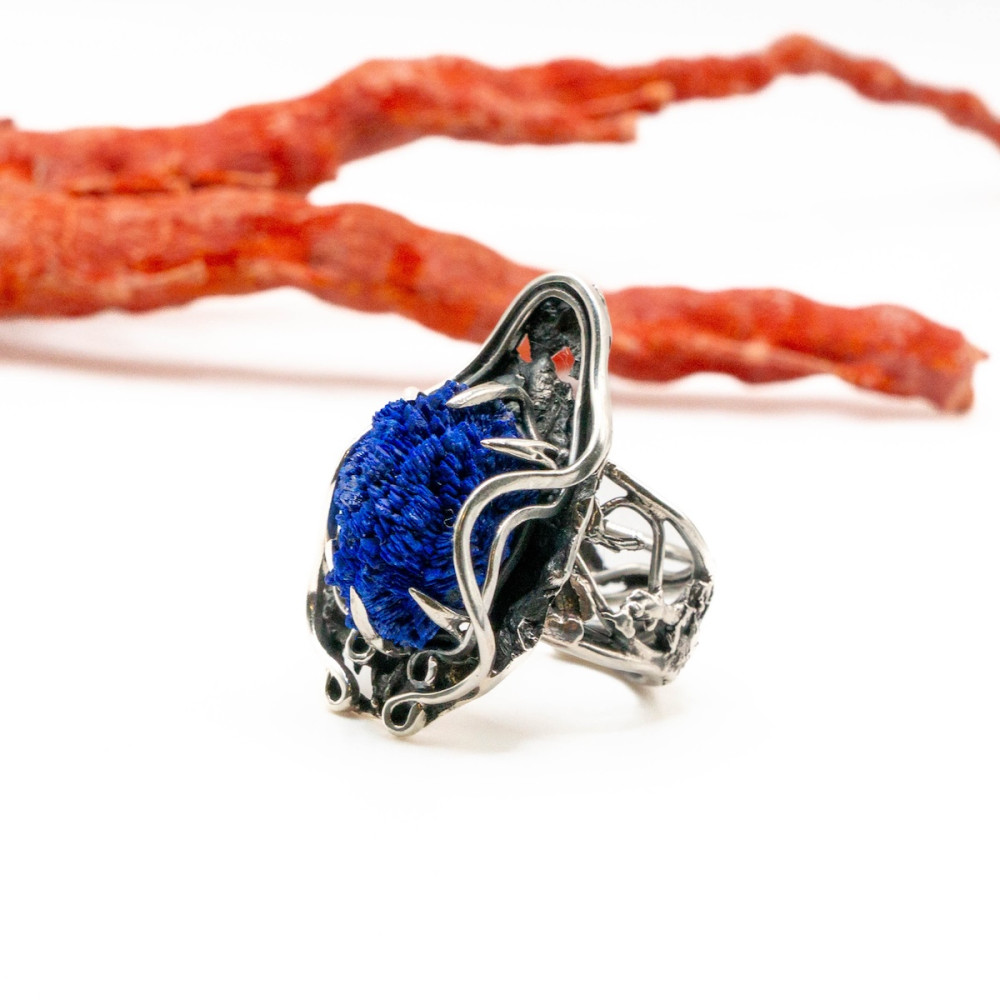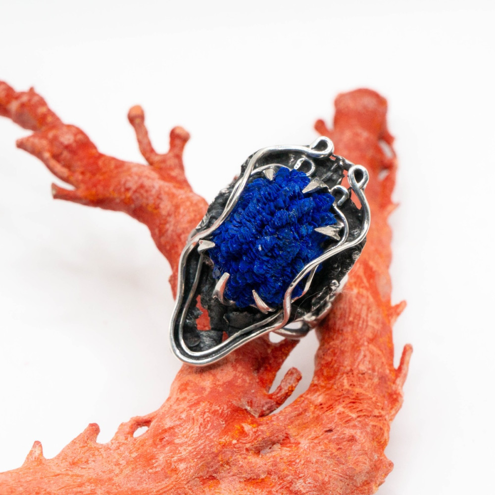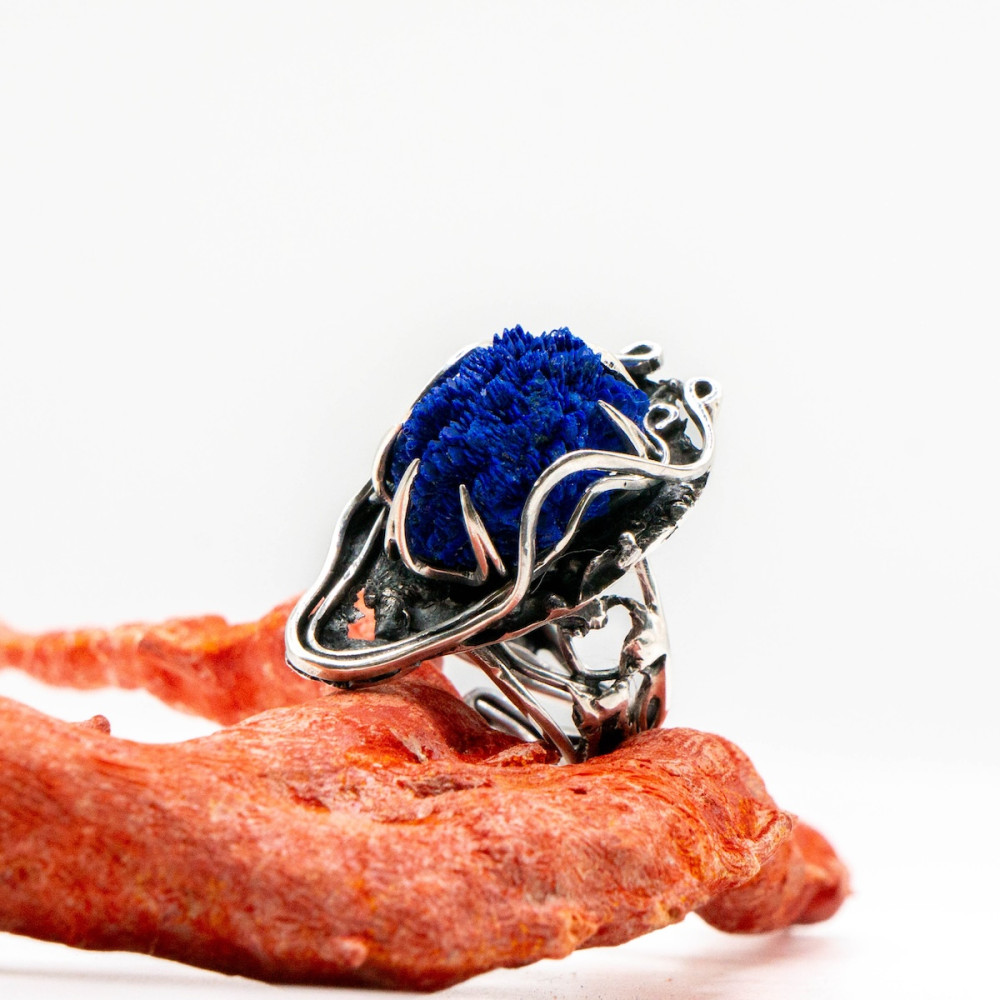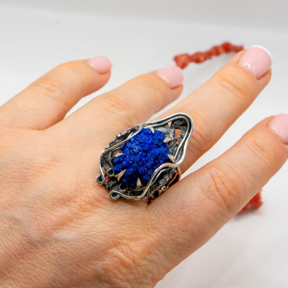 Стильна срібна каблучка з великим натуральним азуритом, виконана вручну — прикраса, що миттєво привертає увагу. Глибокий синій колір каменю робить образ виразним і завершеним. Необроблений азурит підкреслює природну силу та унікальність виробу — кожна каблучка є єдиною у своєму роді.