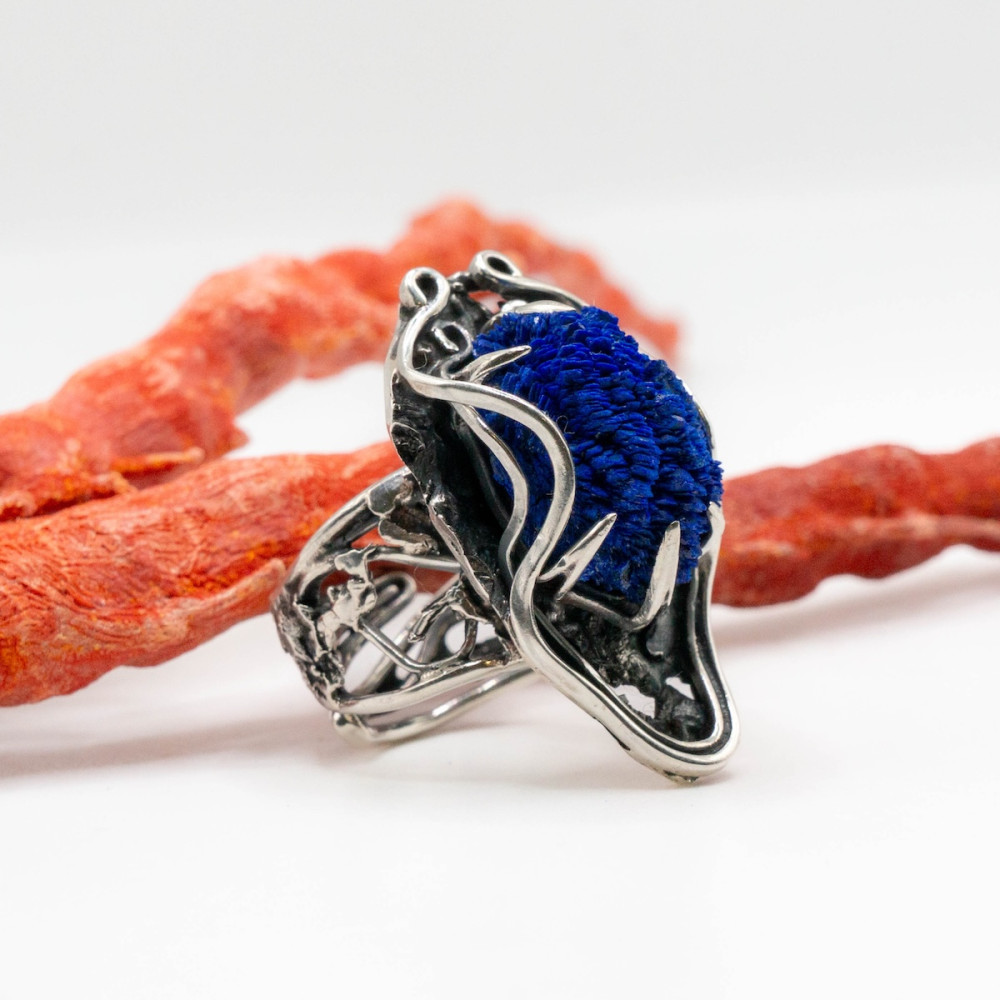 Авторська срібна оправа делікатно обвиває камінь, формуючи сучасний скульптурний дизайн. Ця каблучка легко стає головним акцентом образу й ідеально підходить для тих, хто обирає прикраси з характером.