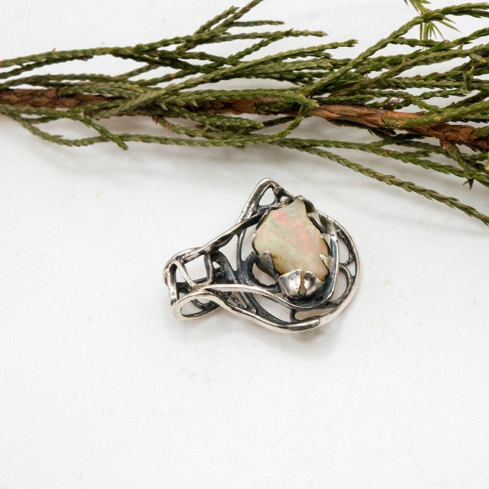 В центре находится большая натуральная опала, переливающаяся нежными оттенками молочного, розового и зеленого цвета.